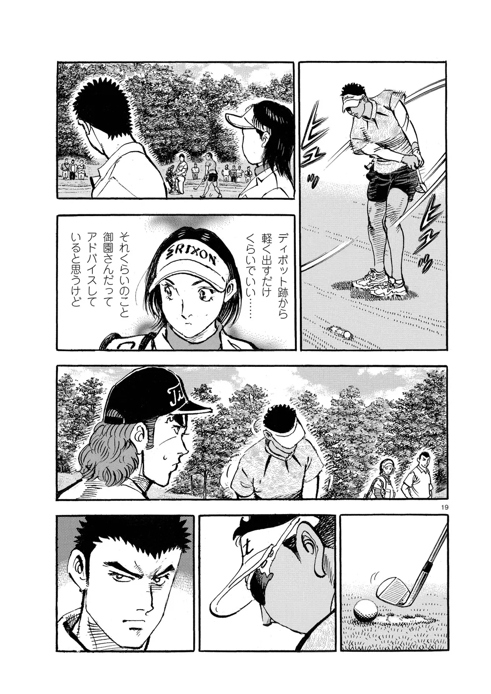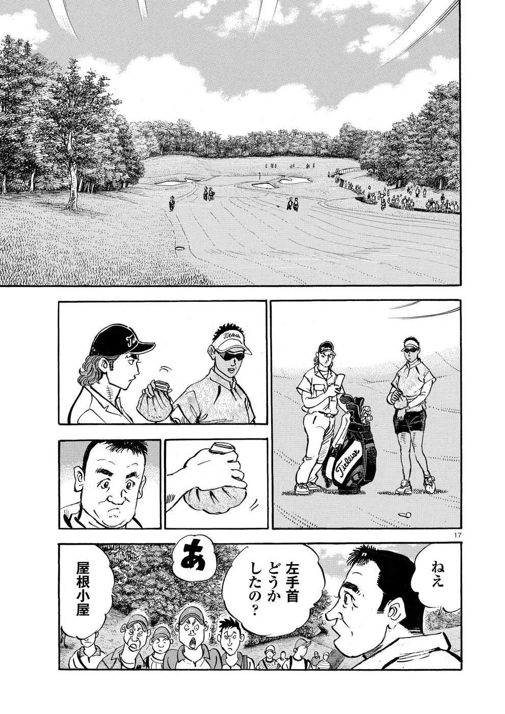 【第76巻あらすじ】ホーライワールドチャンピオンズで鳴海一丸と同組を回る米国人女子アマ・フォスターは、米軍で狙撃観測種を任じられていた帰還兵だった。フォスターと鳴海は、マッチプレーの様相を見せる激しい戦いを展開。だが、車の大きなクラクションの音を聞いた後から、フォスターのショットが乱れ始めた。フォスターは心的外傷後ストレス障害(PTSD)を抱えていた…。