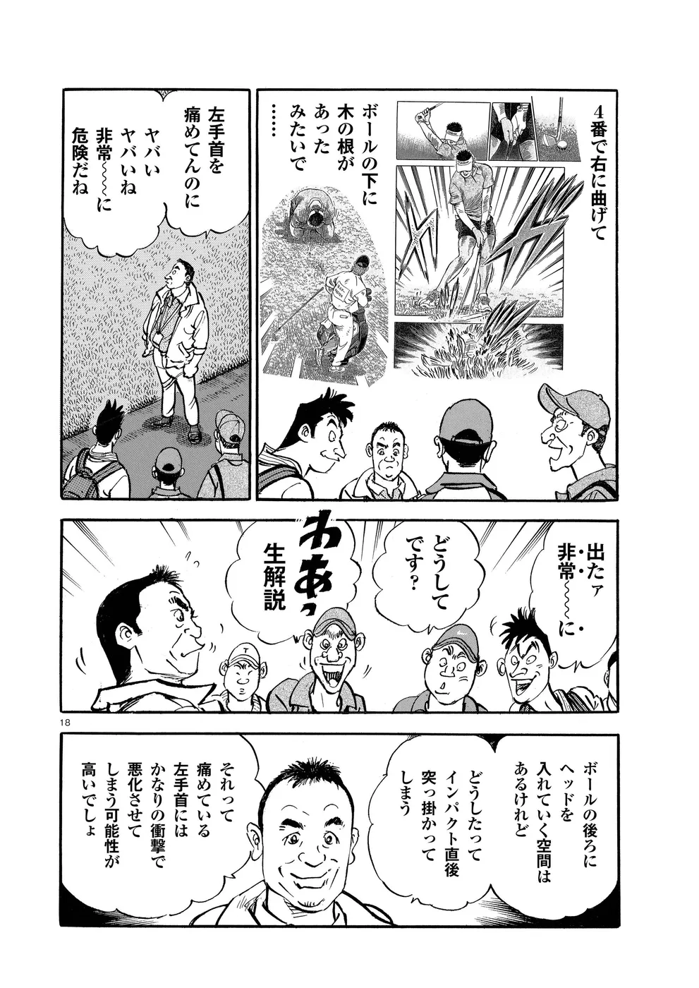【第76巻あらすじ】ホーライワールドチャンピオンズで鳴海一丸と同組を回る米国人女子アマ・フォスターは、米軍で狙撃観測種を任じられていた帰還兵だった。フォスターと鳴海は、マッチプレーの様相を見せる激しい戦いを展開。だが、車の大きなクラクションの音を聞いた後から、フォスターのショットが乱れ始めた。フォスターは心的外傷後ストレス障害(PTSD)を抱えていた…。