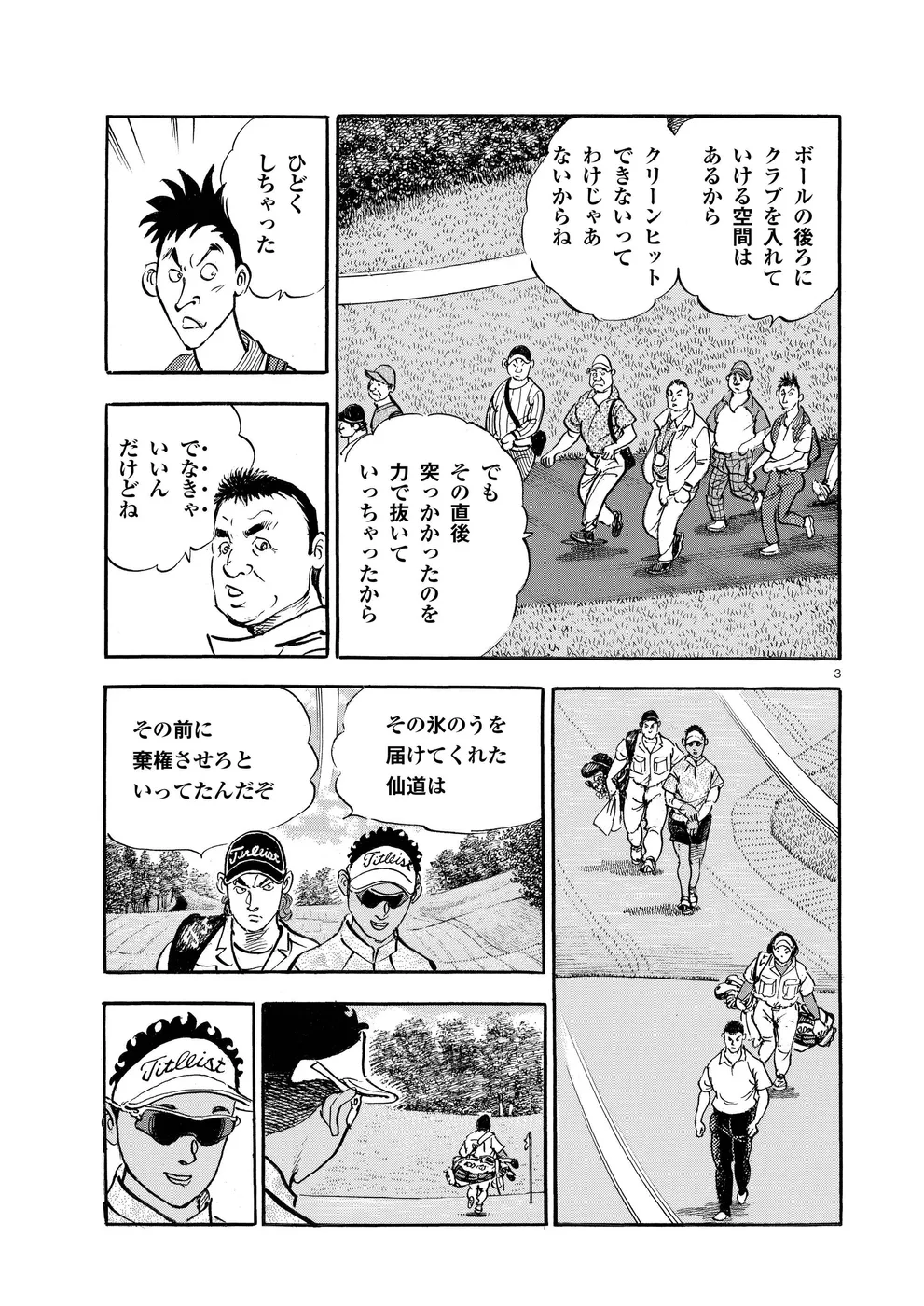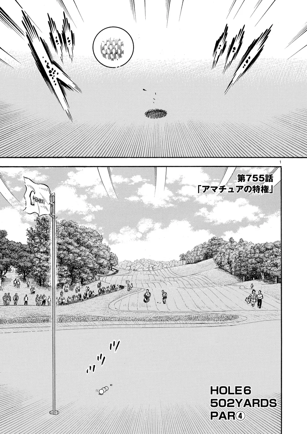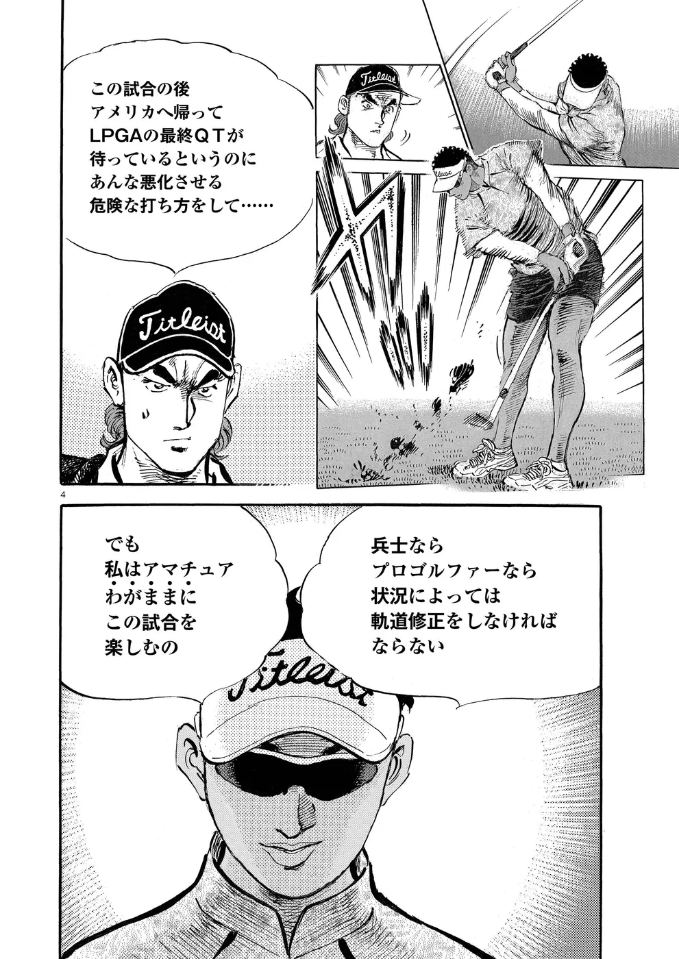 【第76巻あらすじ】ホーライワールドチャンピオンズで鳴海一丸と同組を回る米国人女子アマ・フォスターは、米軍で狙撃観測種を任じられていた帰還兵だった。フォスターと鳴海は、マッチプレーの様相を見せる激しい戦いを展開。だが、車の大きなクラクションの音を聞いた後から、フォスターのショットが乱れ始めた。フォスターは心的外傷後ストレス障害(PTSD)を抱えていた…。