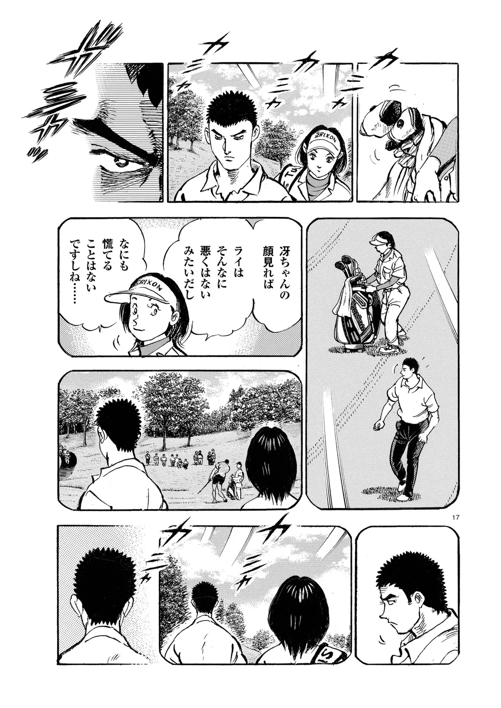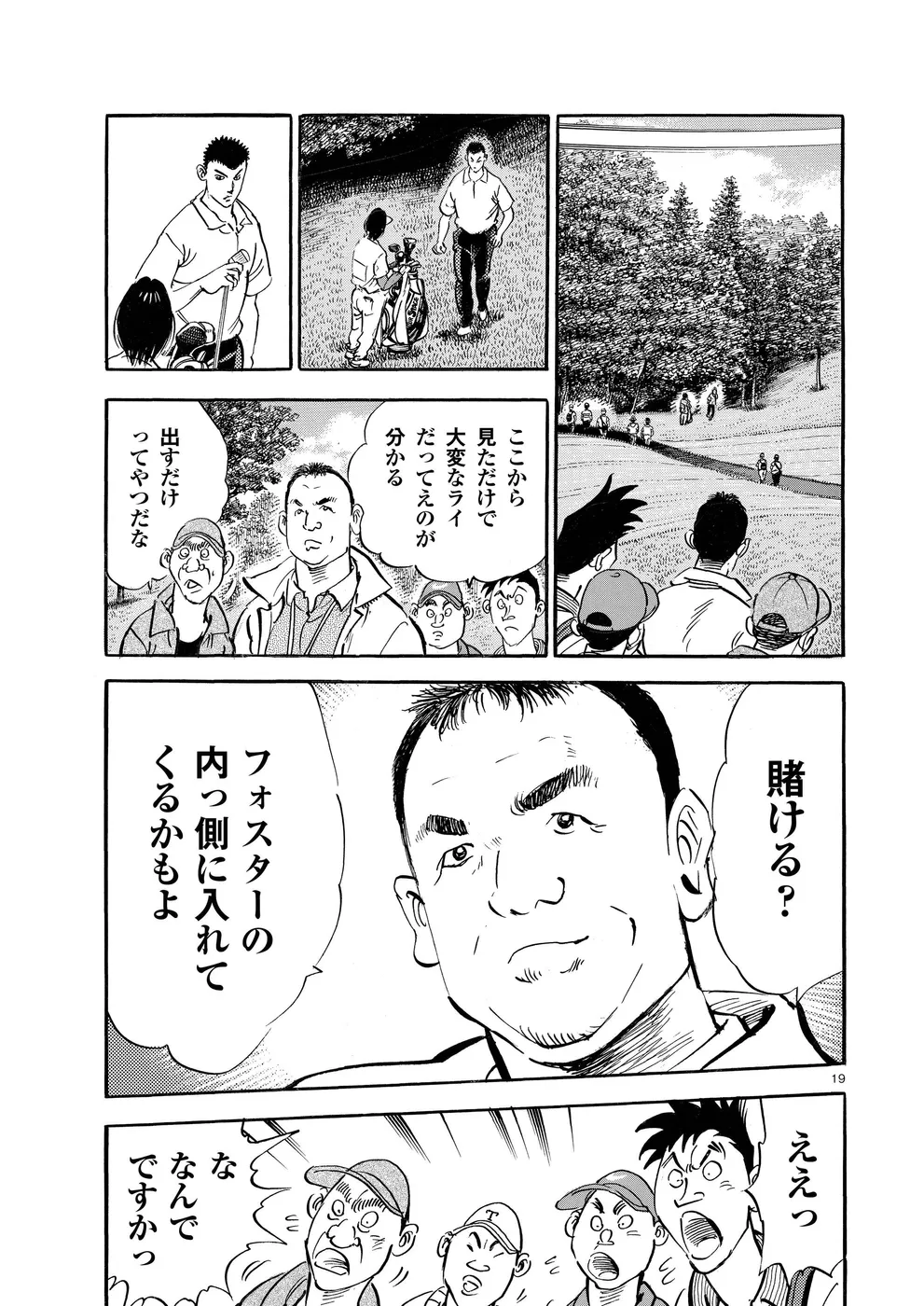 【第76巻あらすじ】ホーライワールドチャンピオンズで鳴海一丸と同組を回る米国人女子アマ・フォスターは、米軍で狙撃観測種を任じられていた帰還兵だった。フォスターと鳴海は、マッチプレーの様相を見せる激しい戦いを展開。だが、車の大きなクラクションの音を聞いた後から、フォスターのショットが乱れ始めた。フォスターは心的外傷後ストレス障害(PTSD)を抱えていた…。