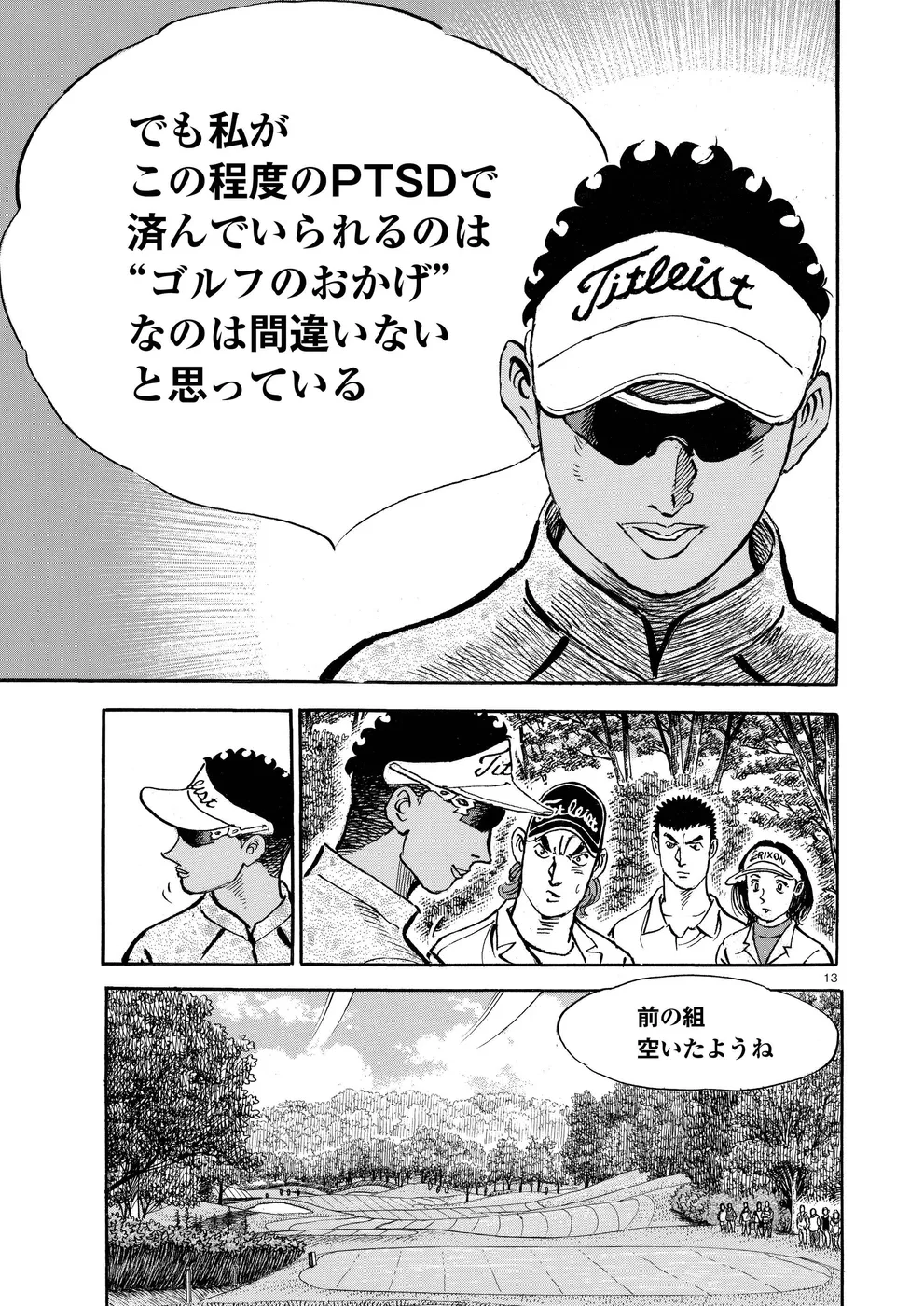 【第76巻あらすじ】ホーライワールドチャンピオンズで鳴海一丸と同組を回る米国人女子アマ・フォスターは、米軍で狙撃観測種を任じられていた帰還兵だった。フォスターと鳴海は、マッチプレーの様相を見せる激しい戦いを展開。だが、車の大きなクラクションの音を聞いた後から、フォスターのショットが乱れ始めた。フォスターは心的外傷後ストレス障害(PTSD)を抱えていた…。