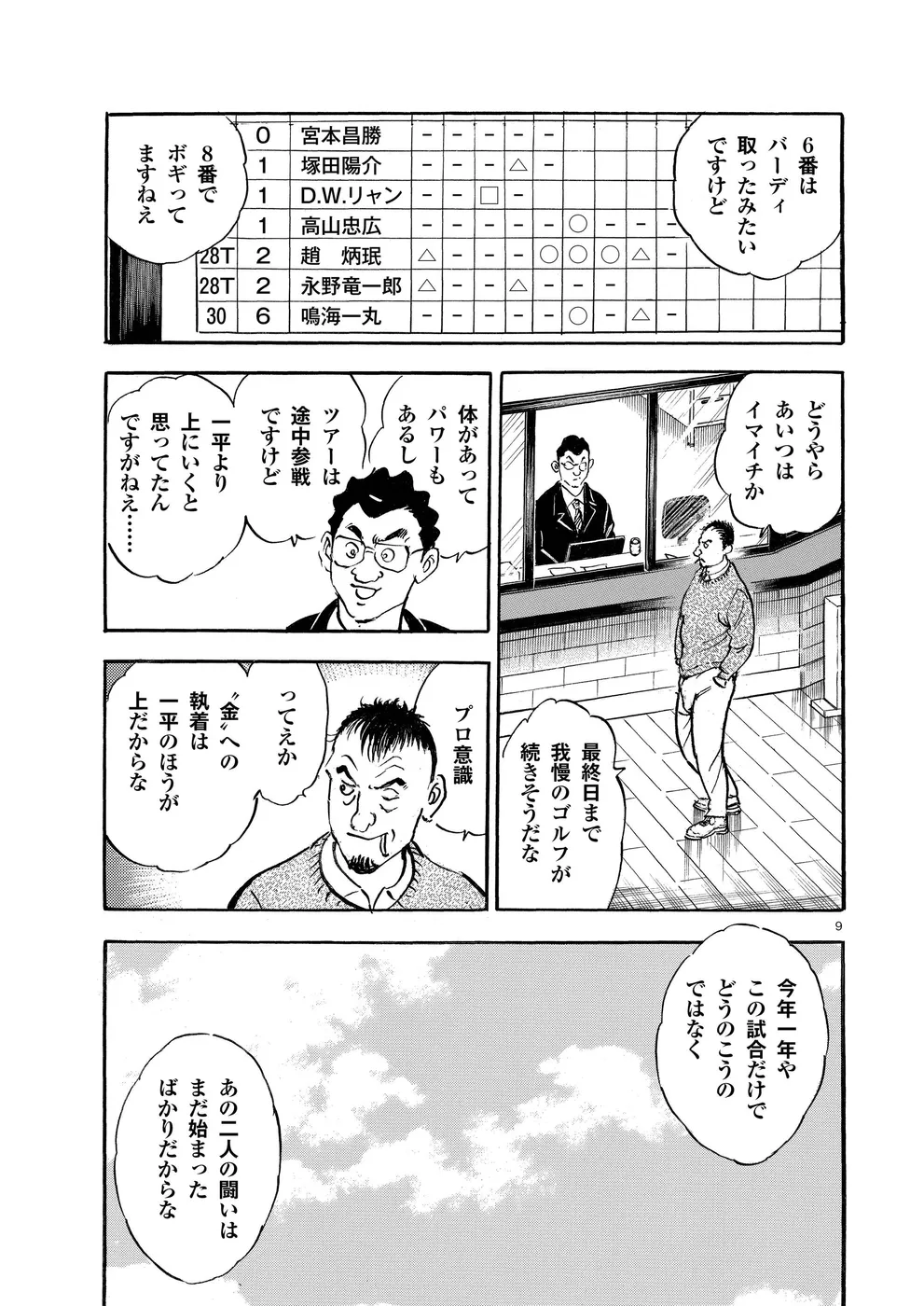 【第78巻あらすじ】シーズン最終戦、ゴルフ日本シリーズJTカップ。鳴海一丸は初日に大たたき、2日目も伸ばせず、最下位で3日目を回っていた。一見落ち着いてじっくりチャンスを待つゴルフをしているようにも見えるのだが、それはいつもの一丸の攻めではなかった。その姿は、プロゴルファーとしての己の在り方を悩んでいるようにも見えた。そして迎えた最終日…、一丸の表情に変化が!