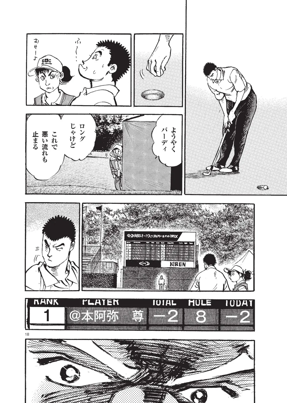 【第81巻あらすじ】芥屋ゴルフ倶楽部で行われるKBSオーガスタでは、主人公・鳴海一丸のキャディを母親・鳴海玲が務めること。一時はギクシャクしたふたりだったが、いまひとつプレーに精彩を欠いていた一丸を、玲の策略で修正する。気づけば一丸を気にかける少年・本阿弥尊が初日5アンダー2位タイ。天才テニスプレーヤーの過去を持つ彼がなぜゴルフに!?無名のスーパージュニアプロに周囲は騒然!一方、出遅れた一丸にとって、攻めるしかない2日目が強風の中スタートした。
