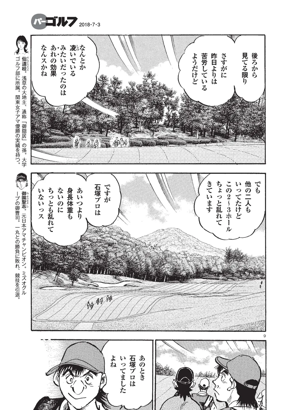 【第82巻あらすじ】KBSオーガスタ2日目、ボギー発進の主人公・一丸だが、キャディを務める母・玲との連係もうまく絡み合い、強風のなか3つスコアを伸ばし辛うじて予選通過する。ラウンド後の練習では、本試合、大注目の元天才テニスプレーヤー・本阿弥尊が接近。一丸の後ろの打席へ強引に割り込み、伝説の「同時打ち」を敢行する。それは4打差で上位をキープする尊にとって、一丸と同組でプレーできないもどかしさを解消するためのものだった。さらに3日目、尊がアマチュア最年少での優勝を宣言したことから、一丸の闘争心に火が付く。攻めのゴルフを展開する一丸にチャンスは巡ってくるのか!?