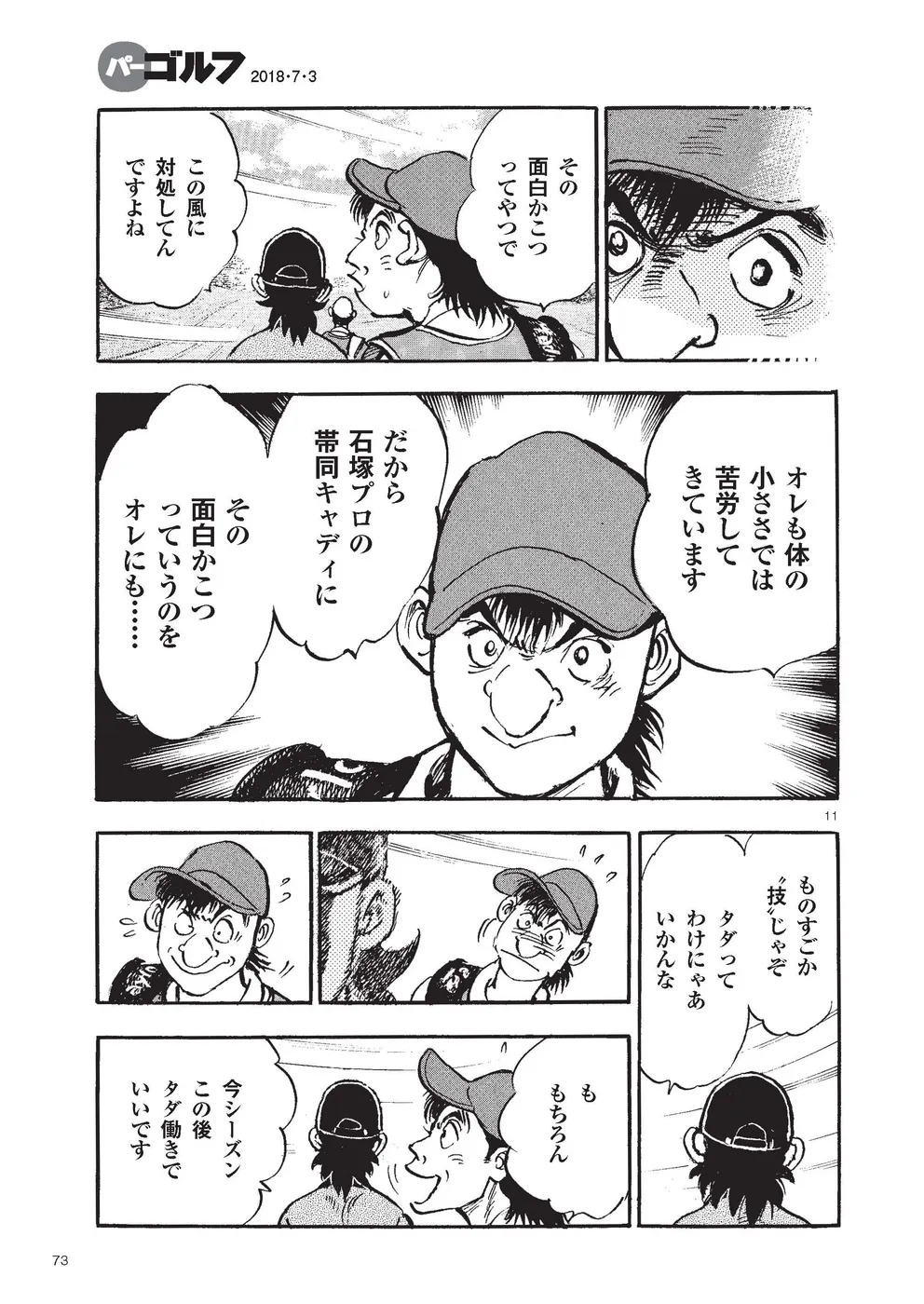 【第82巻あらすじ】KBSオーガスタ2日目、ボギー発進の主人公・一丸だが、キャディを務める母・玲との連係もうまく絡み合い、強風のなか3つスコアを伸ばし辛うじて予選通過する。ラウンド後の練習では、本試合、大注目の元天才テニスプレーヤー・本阿弥尊が接近。一丸の後ろの打席へ強引に割り込み、伝説の「同時打ち」を敢行する。それは4打差で上位をキープする尊にとって、一丸と同組でプレーできないもどかしさを解消するためのものだった。さらに3日目、尊がアマチュア最年少での優勝を宣言したことから、一丸の闘争心に火が付く。攻めのゴルフを展開する一丸にチャンスは巡ってくるのか!?