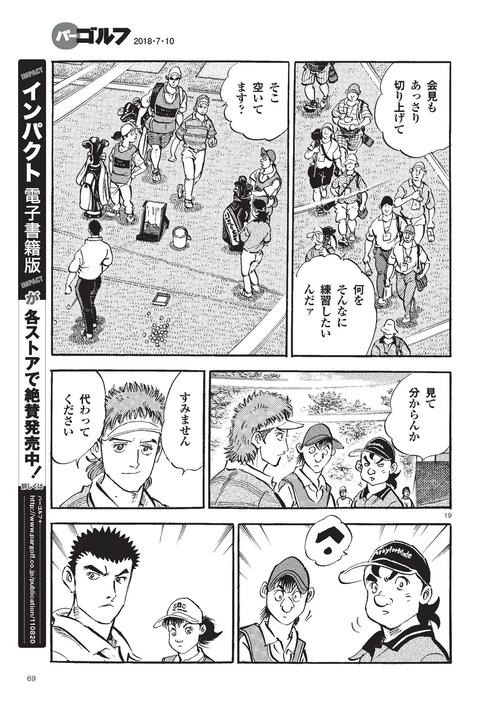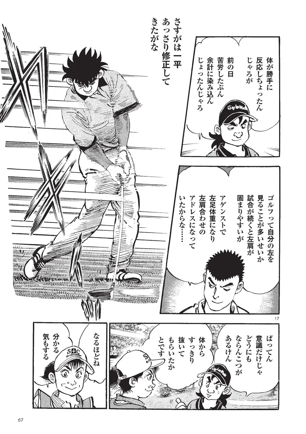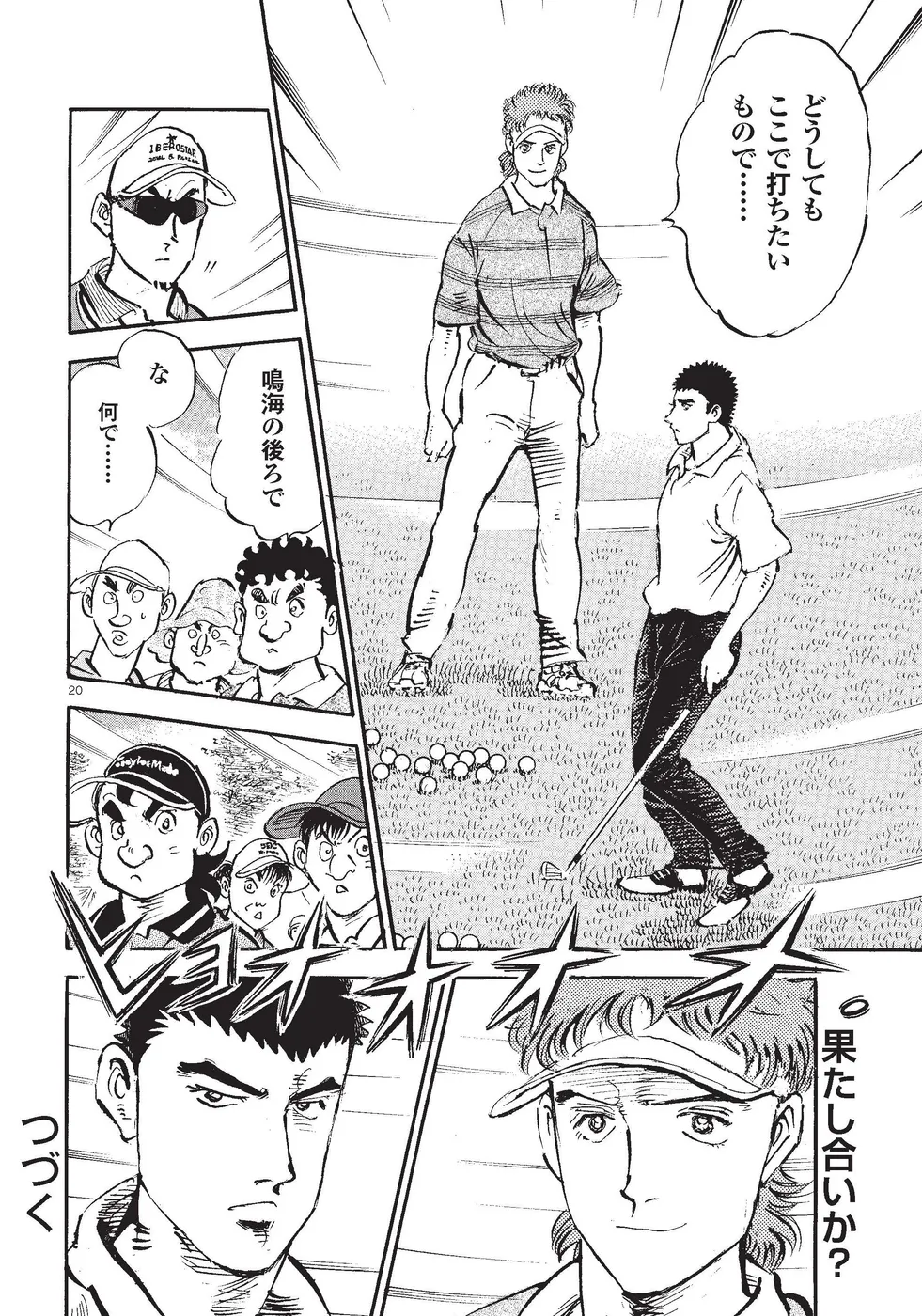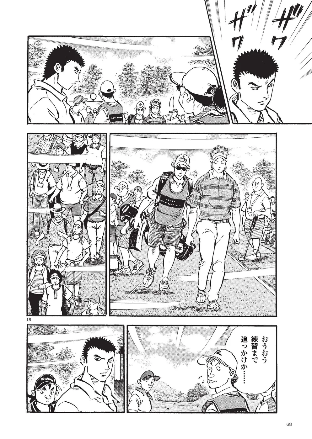 【第82巻あらすじ】KBSオーガスタ2日目、ボギー発進の主人公・一丸だが、キャディを務める母・玲との連係もうまく絡み合い、強風のなか3つスコアを伸ばし辛うじて予選通過する。ラウンド後の練習では、本試合、大注目の元天才テニスプレーヤー・本阿弥尊が接近。一丸の後ろの打席へ強引に割り込み、伝説の「同時打ち」を敢行する。それは4打差で上位をキープする尊にとって、一丸と同組でプレーできないもどかしさを解消するためのものだった。さらに3日目、尊がアマチュア最年少での優勝を宣言したことから、一丸の闘争心に火が付く。攻めのゴルフを展開する一丸にチャンスは巡ってくるのか!?