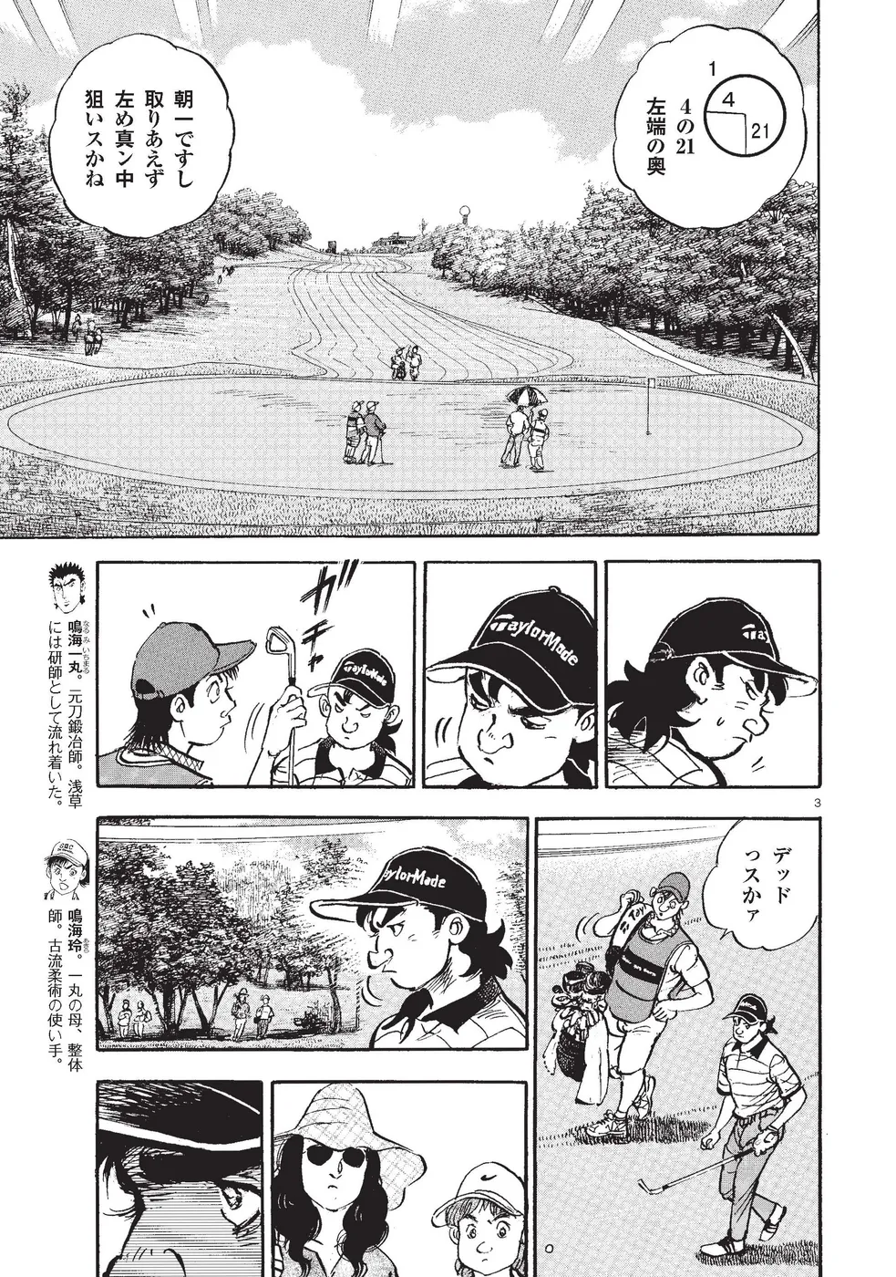 【第82巻あらすじ】KBSオーガスタ2日目、ボギー発進の主人公・一丸だが、キャディを務める母・玲との連係もうまく絡み合い、強風のなか3つスコアを伸ばし辛うじて予選通過する。ラウンド後の練習では、本試合、大注目の元天才テニスプレーヤー・本阿弥尊が接近。一丸の後ろの打席へ強引に割り込み、伝説の「同時打ち」を敢行する。それは4打差で上位をキープする尊にとって、一丸と同組でプレーできないもどかしさを解消するためのものだった。さらに3日目、尊がアマチュア最年少での優勝を宣言したことから、一丸の闘争心に火が付く。攻めのゴルフを展開する一丸にチャンスは巡ってくるのか!?
