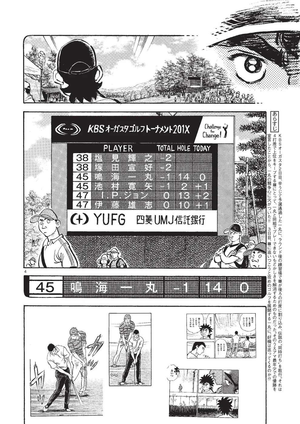 【第82巻あらすじ】KBSオーガスタ2日目、ボギー発進の主人公・一丸だが、キャディを務める母・玲との連係もうまく絡み合い、強風のなか3つスコアを伸ばし辛うじて予選通過する。ラウンド後の練習では、本試合、大注目の元天才テニスプレーヤー・本阿弥尊が接近。一丸の後ろの打席へ強引に割り込み、伝説の「同時打ち」を敢行する。それは4打差で上位をキープする尊にとって、一丸と同組でプレーできないもどかしさを解消するためのものだった。さらに3日目、尊がアマチュア最年少での優勝を宣言したことから、一丸の闘争心に火が付く。攻めのゴルフを展開する一丸にチャンスは巡ってくるのか!?