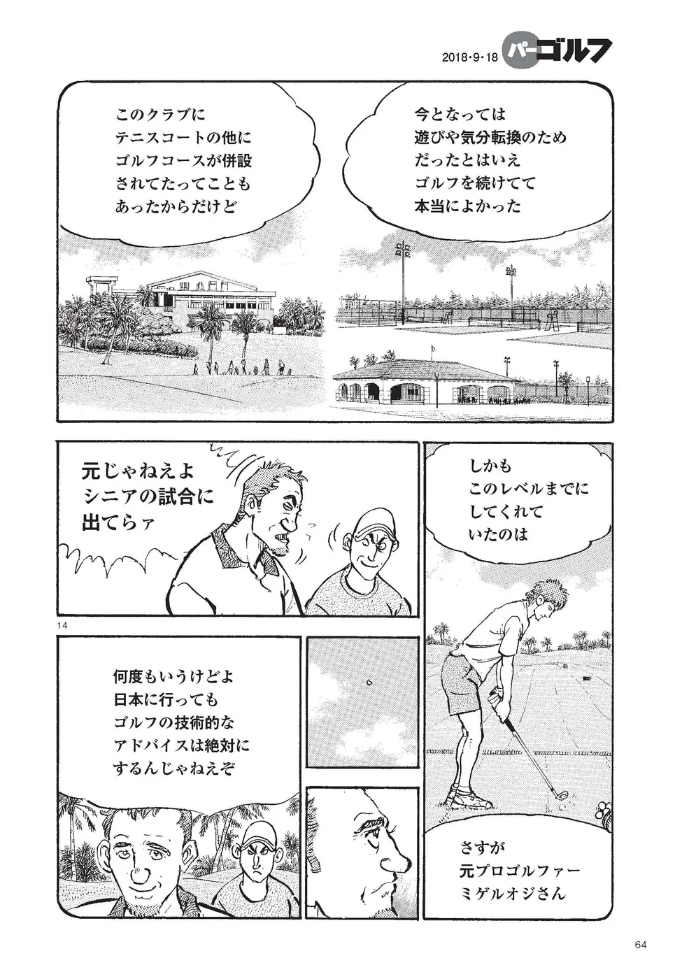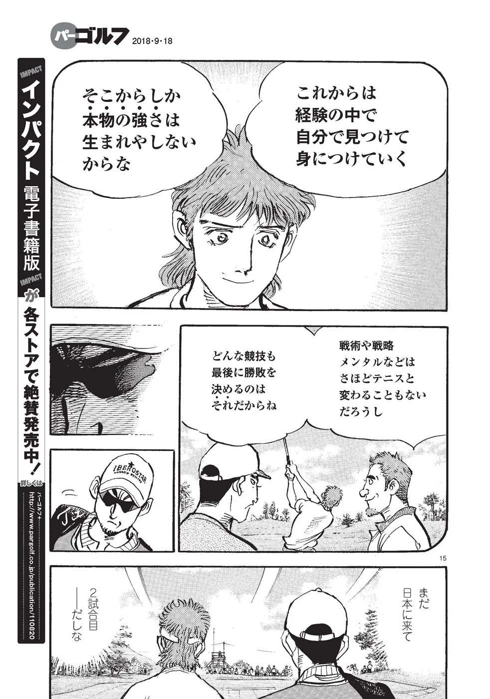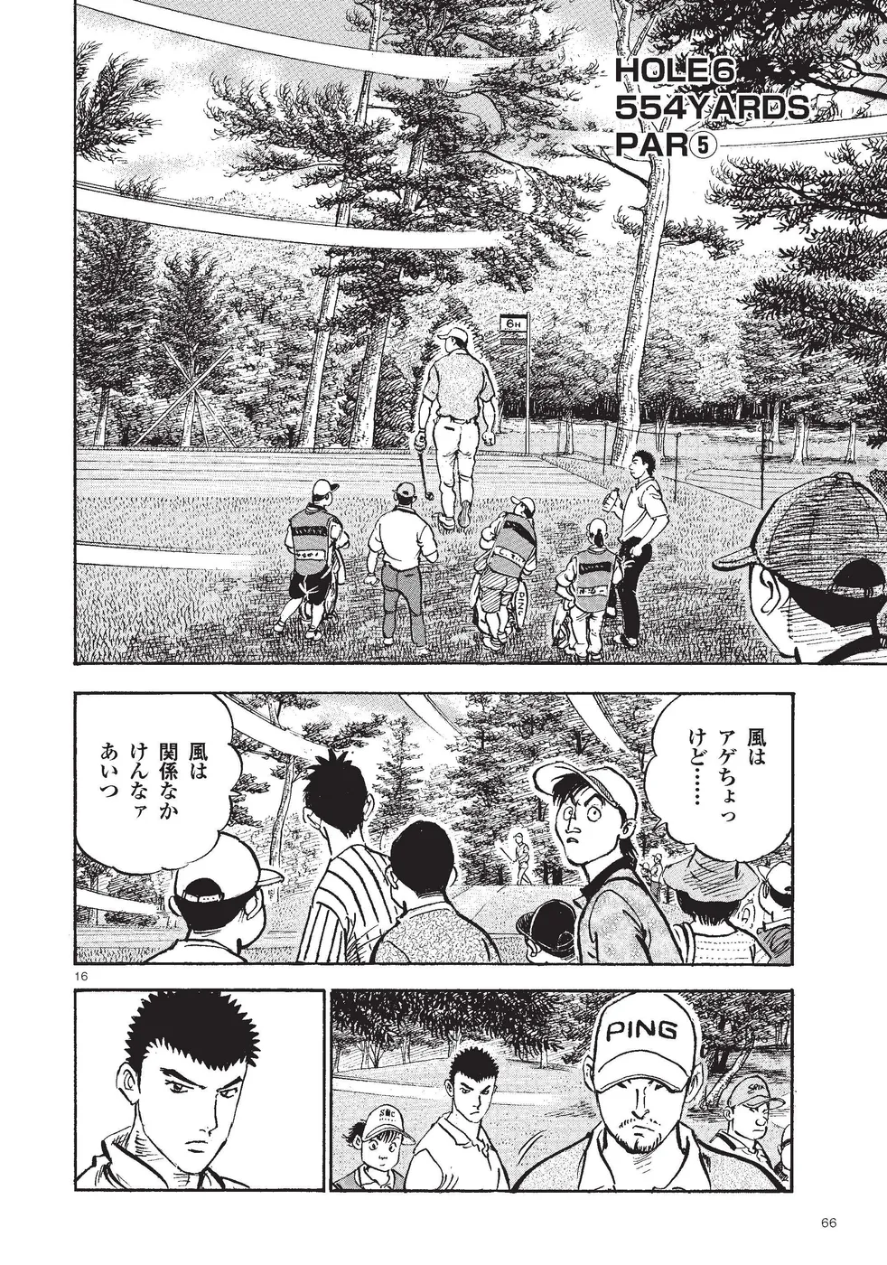【第83巻あらすじ】KBSオーガスタ3日目、辛うじて予選通過した一丸は、アマ最年少での優勝宣言をした本阿弥尊に闘争心をかき立てられ、4打差を縮めるべくスタートから攻めのゴルフを展開。パットは不調ながら、手作りSWのショットの感触は上々で、INスタートの17番でバーディー奪取。順調にスコアを伸ばし迎えた最終ホール、同組の飛ばし屋のスイングを見盗って渾身のビッグドライブ。順位を8位に上げ、最終日は尊と同組になった。しかし、思わぬ人物が現れたことで一丸のショットに変化が―。