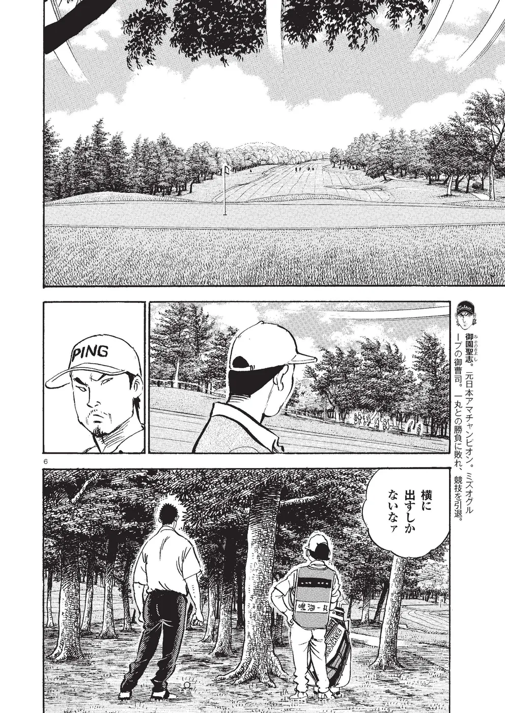 【第83巻あらすじ】KBSオーガスタ3日目、辛うじて予選通過した一丸は、アマ最年少での優勝宣言をした本阿弥尊に闘争心をかき立てられ、4打差を縮めるべくスタートから攻めのゴルフを展開。パットは不調ながら、手作りSWのショットの感触は上々で、INスタートの17番でバーディー奪取。順調にスコアを伸ばし迎えた最終ホール、同組の飛ばし屋のスイングを見盗って渾身のビッグドライブ。順位を8位に上げ、最終日は尊と同組になった。しかし、思わぬ人物が現れたことで一丸のショットに変化が―。