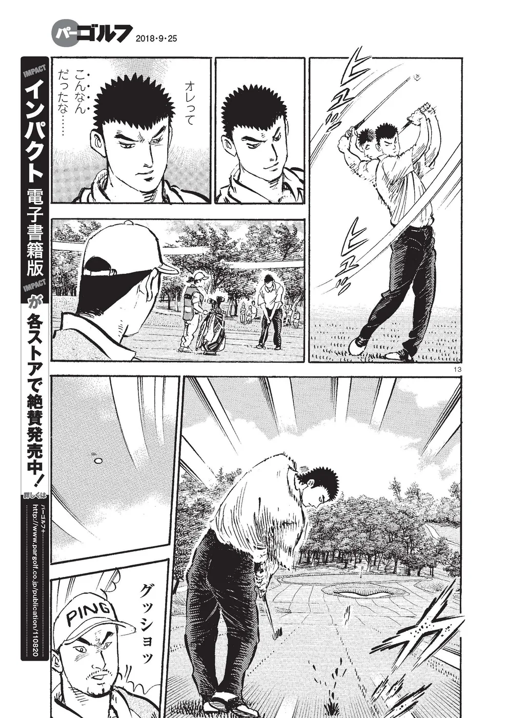 【第83巻あらすじ】KBSオーガスタ3日目、辛うじて予選通過した一丸は、アマ最年少での優勝宣言をした本阿弥尊に闘争心をかき立てられ、4打差を縮めるべくスタートから攻めのゴルフを展開。パットは不調ながら、手作りSWのショットの感触は上々で、INスタートの17番でバーディー奪取。順調にスコアを伸ばし迎えた最終ホール、同組の飛ばし屋のスイングを見盗って渾身のビッグドライブ。順位を8位に上げ、最終日は尊と同組になった。しかし、思わぬ人物が現れたことで一丸のショットに変化が―。