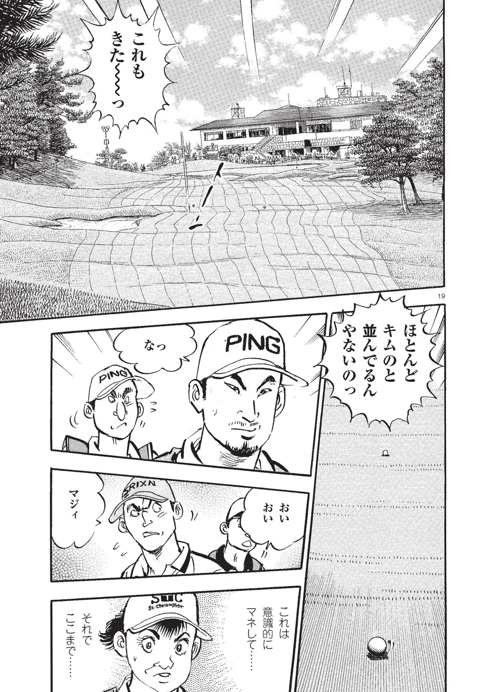 【第83巻あらすじ】KBSオーガスタ3日目、辛うじて予選通過した一丸は、アマ最年少での優勝宣言をした本阿弥尊に闘争心をかき立てられ、4打差を縮めるべくスタートから攻めのゴルフを展開。パットは不調ながら、手作りSWのショットの感触は上々で、INスタートの17番でバーディー奪取。順調にスコアを伸ばし迎えた最終ホール、同組の飛ばし屋のスイングを見盗って渾身のビッグドライブ。順位を8位に上げ、最終日は尊と同組になった。しかし、思わぬ人物が現れたことで一丸のショットに変化が―。