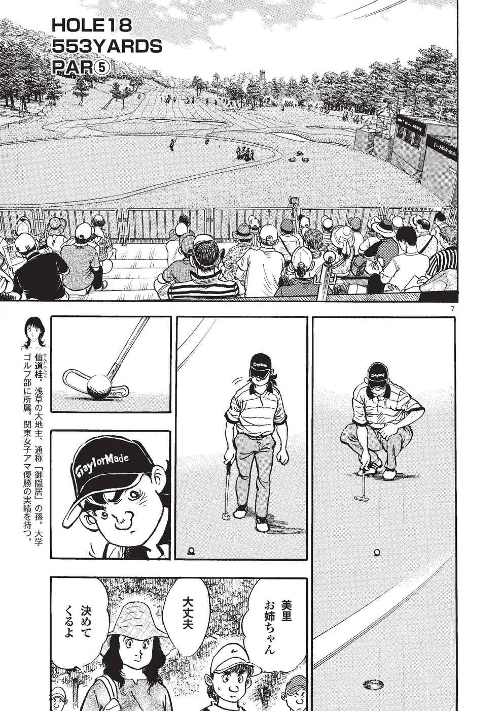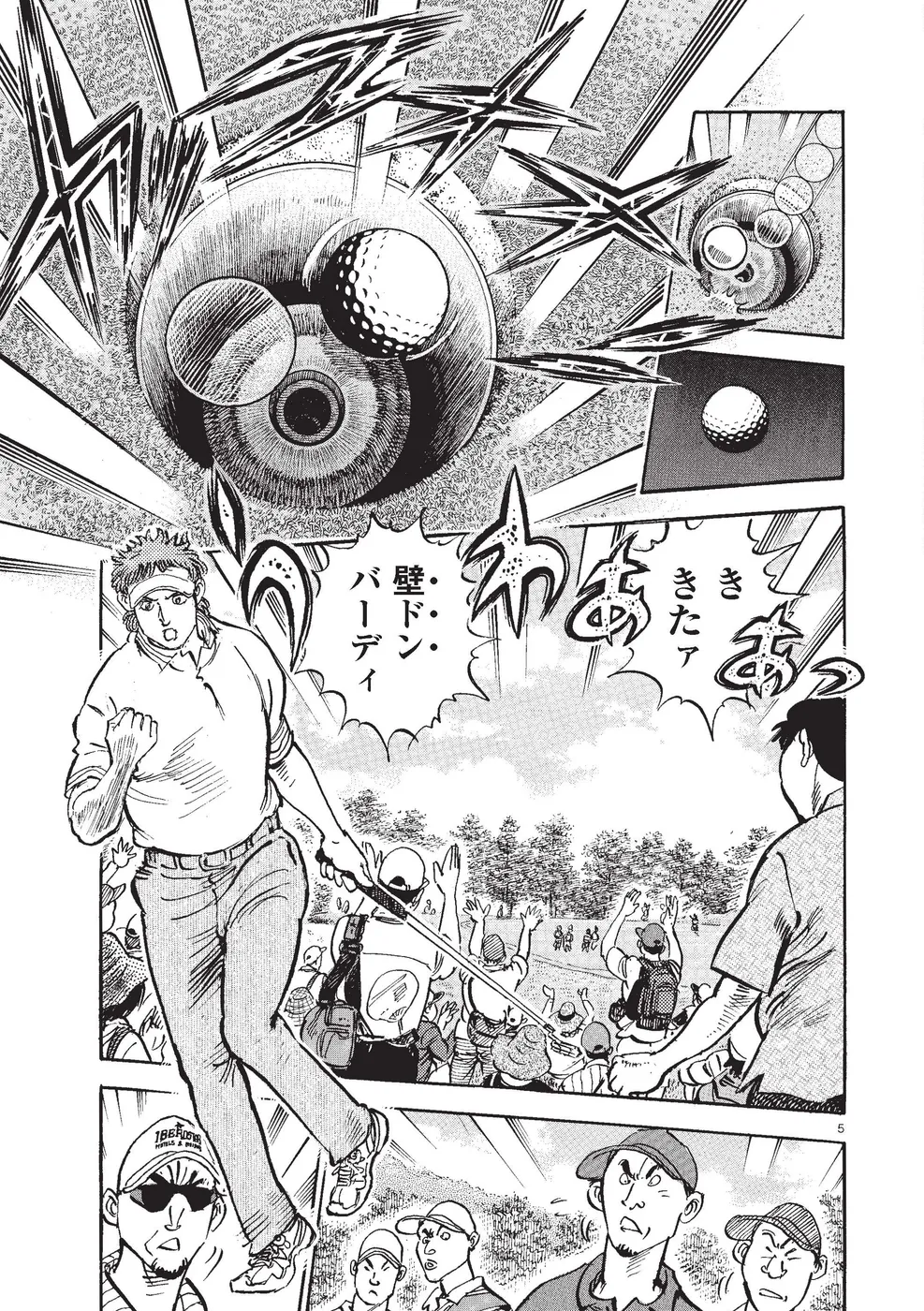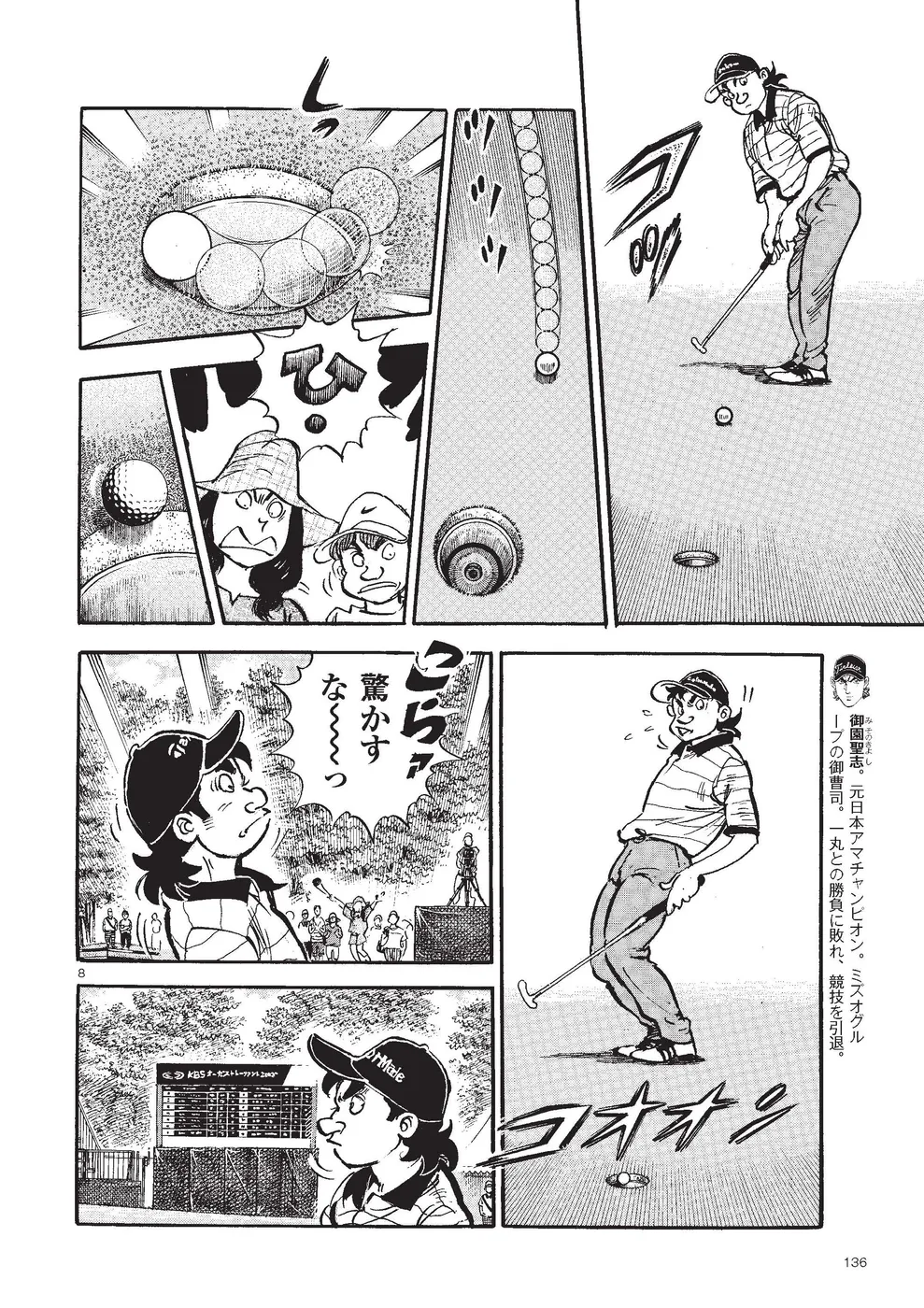 【第83巻あらすじ】KBSオーガスタ3日目、辛うじて予選通過した一丸は、アマ最年少での優勝宣言をした本阿弥尊に闘争心をかき立てられ、4打差を縮めるべくスタートから攻めのゴルフを展開。パットは不調ながら、手作りSWのショットの感触は上々で、INスタートの17番でバーディー奪取。順調にスコアを伸ばし迎えた最終ホール、同組の飛ばし屋のスイングを見盗って渾身のビッグドライブ。順位を8位に上げ、最終日は尊と同組になった。しかし、思わぬ人物が現れたことで一丸のショットに変化が―。