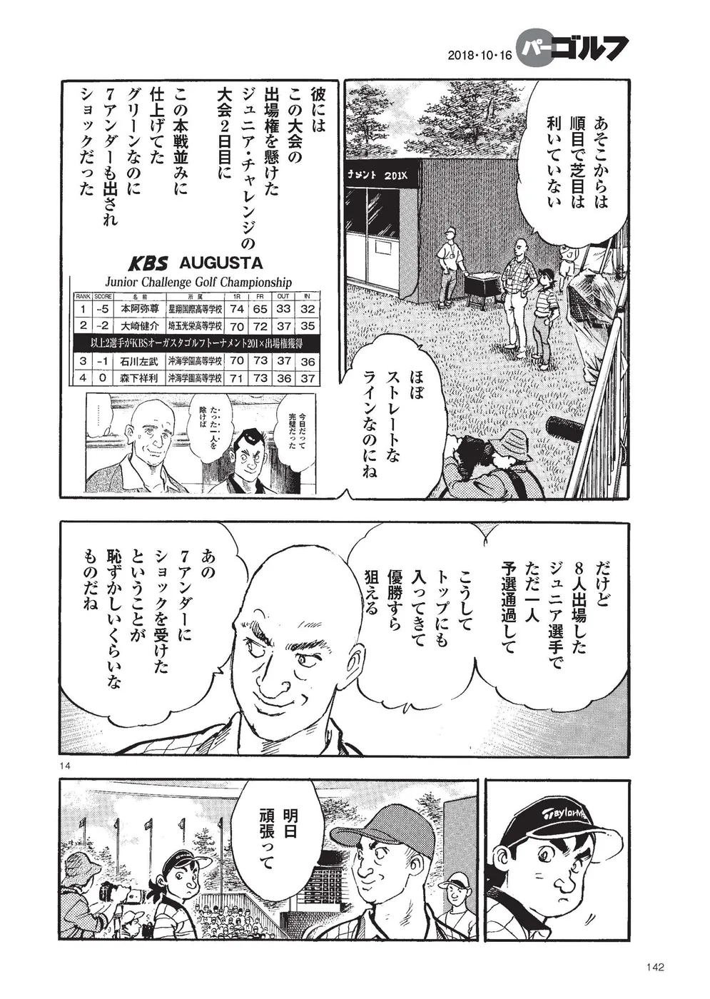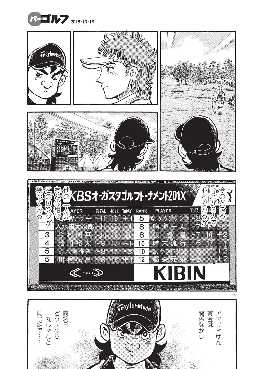 【第83巻あらすじ】KBSオーガスタ3日目、辛うじて予選通過した一丸は、アマ最年少での優勝宣言をした本阿弥尊に闘争心をかき立てられ、4打差を縮めるべくスタートから攻めのゴルフを展開。パットは不調ながら、手作りSWのショットの感触は上々で、INスタートの17番でバーディー奪取。順調にスコアを伸ばし迎えた最終ホール、同組の飛ばし屋のスイングを見盗って渾身のビッグドライブ。順位を8位に上げ、最終日は尊と同組になった。しかし、思わぬ人物が現れたことで一丸のショットに変化が―。