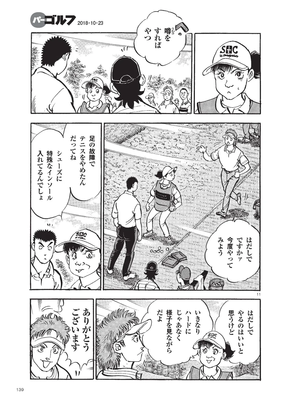 【第83巻あらすじ】KBSオーガスタ3日目、辛うじて予選通過した一丸は、アマ最年少での優勝宣言をした本阿弥尊に闘争心をかき立てられ、4打差を縮めるべくスタートから攻めのゴルフを展開。パットは不調ながら、手作りSWのショットの感触は上々で、INスタートの17番でバーディー奪取。順調にスコアを伸ばし迎えた最終ホール、同組の飛ばし屋のスイングを見盗って渾身のビッグドライブ。順位を8位に上げ、最終日は尊と同組になった。しかし、思わぬ人物が現れたことで一丸のショットに変化が―。