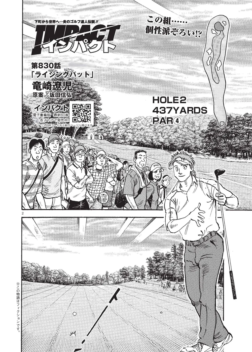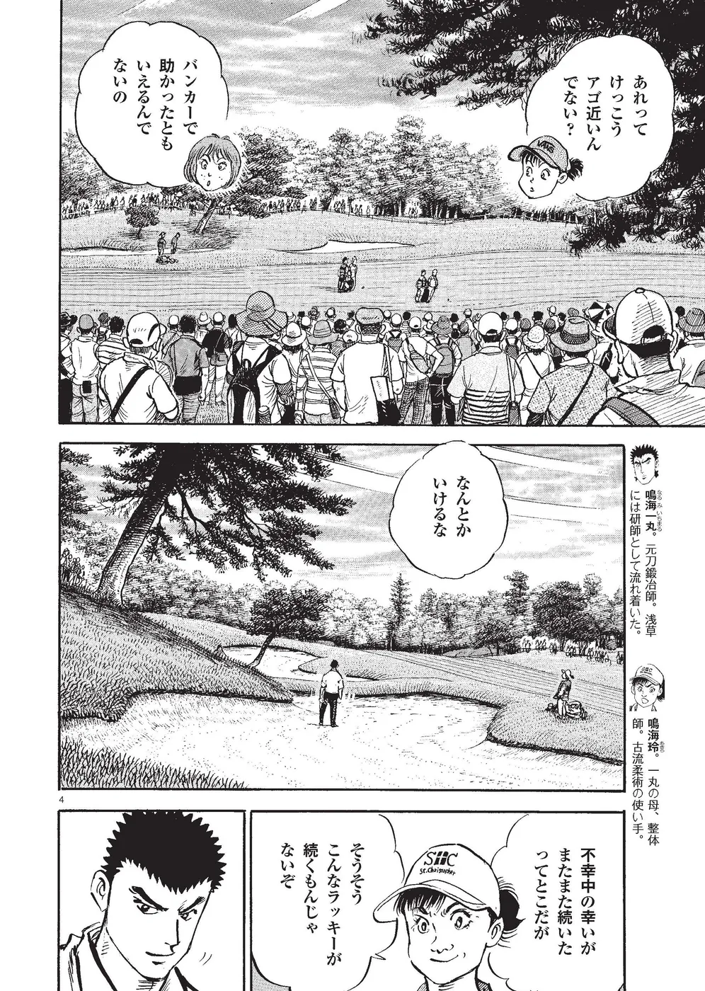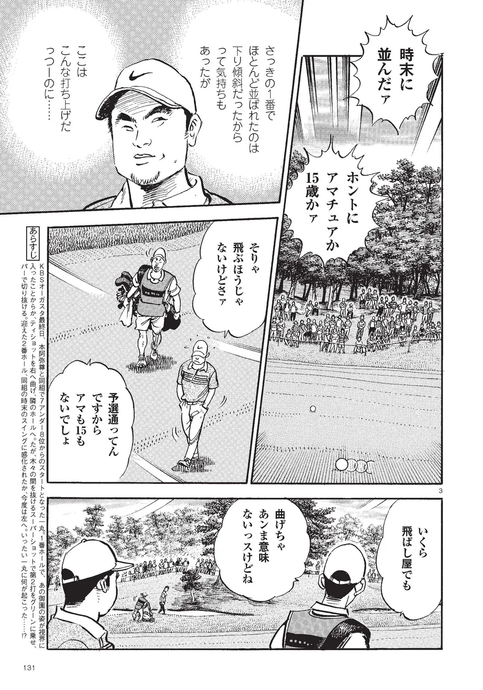 【第83巻あらすじ】KBSオーガスタ3日目、辛うじて予選通過した一丸は、アマ最年少での優勝宣言をした本阿弥尊に闘争心をかき立てられ、4打差を縮めるべくスタートから攻めのゴルフを展開。パットは不調ながら、手作りSWのショットの感触は上々で、INスタートの17番でバーディー奪取。順調にスコアを伸ばし迎えた最終ホール、同組の飛ばし屋のスイングを見盗って渾身のビッグドライブ。順位を8位に上げ、最終日は尊と同組になった。しかし、思わぬ人物が現れたことで一丸のショットに変化が―。