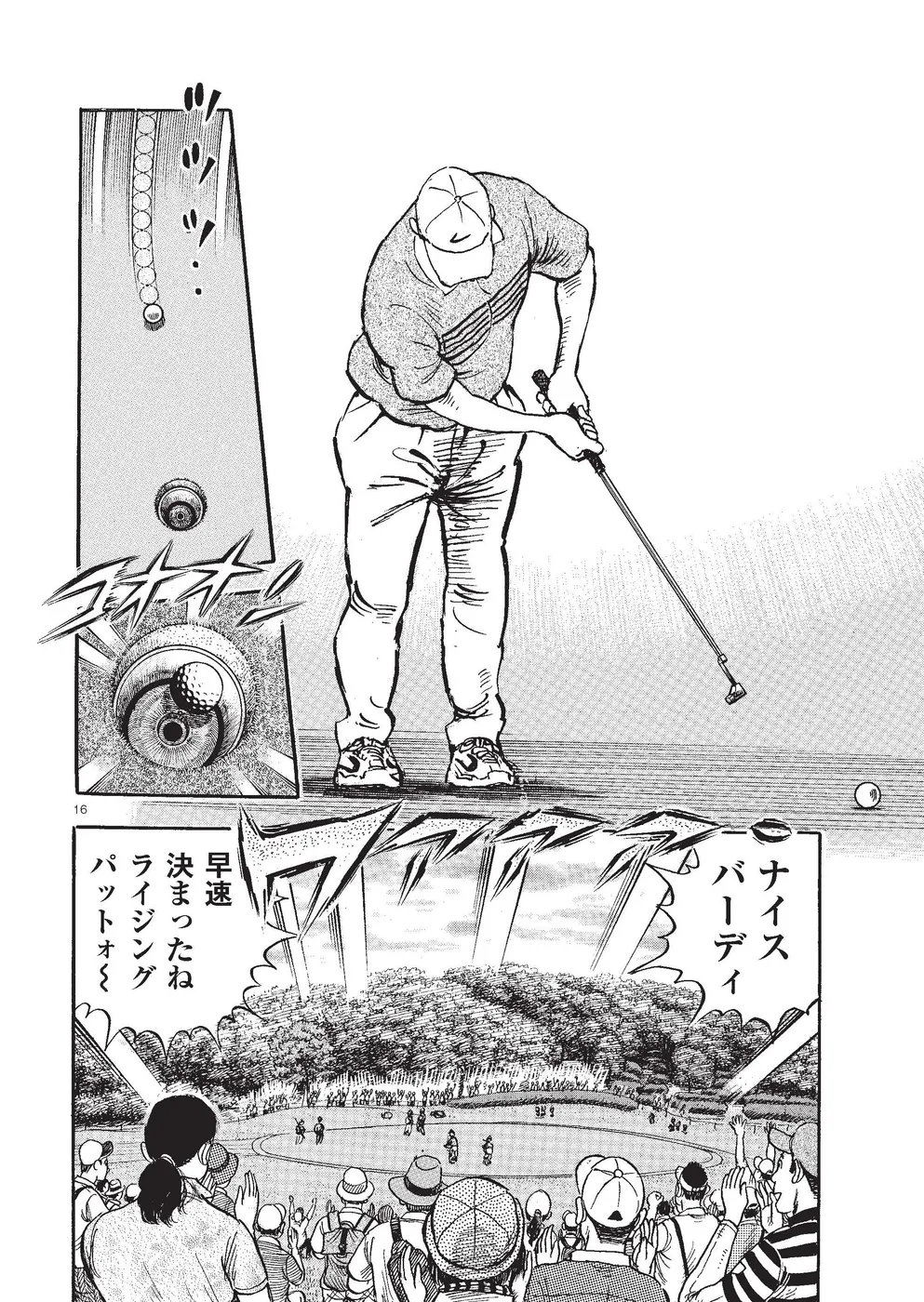 【第83巻あらすじ】KBSオーガスタ3日目、辛うじて予選通過した一丸は、アマ最年少での優勝宣言をした本阿弥尊に闘争心をかき立てられ、4打差を縮めるべくスタートから攻めのゴルフを展開。パットは不調ながら、手作りSWのショットの感触は上々で、INスタートの17番でバーディー奪取。順調にスコアを伸ばし迎えた最終ホール、同組の飛ばし屋のスイングを見盗って渾身のビッグドライブ。順位を8位に上げ、最終日は尊と同組になった。しかし、思わぬ人物が現れたことで一丸のショットに変化が―。