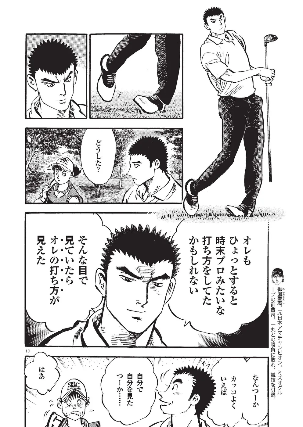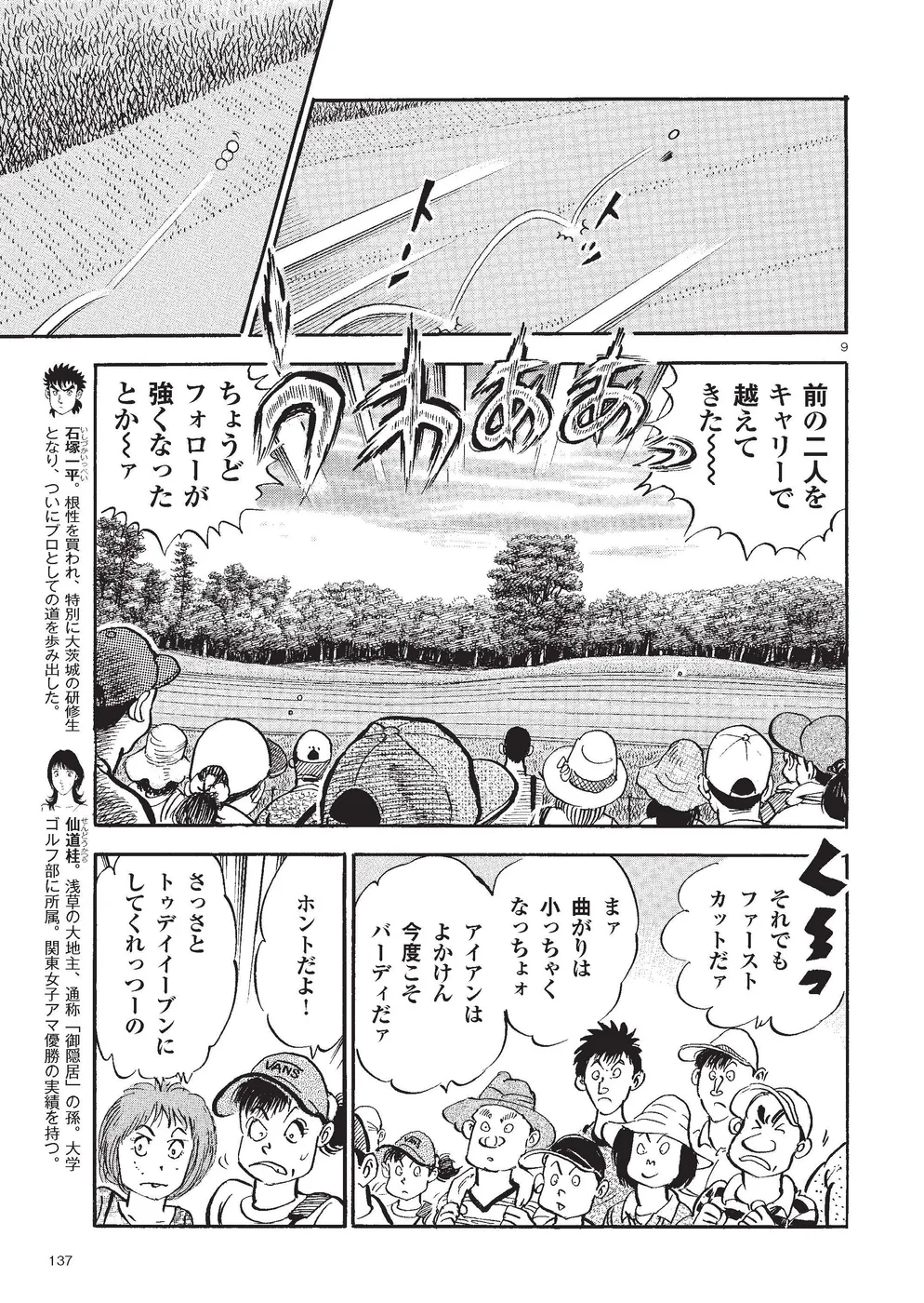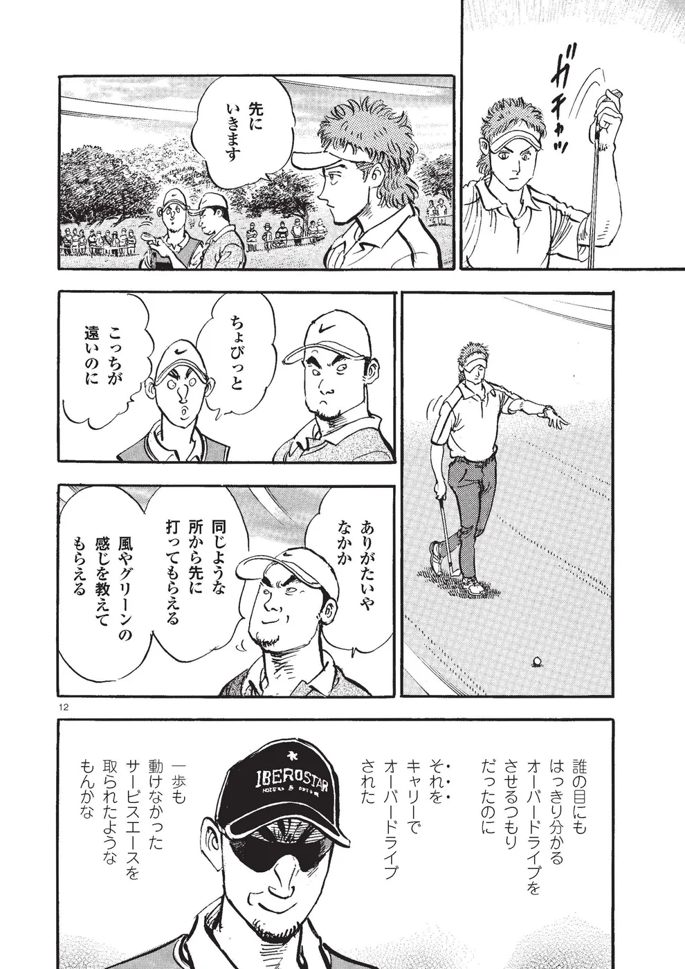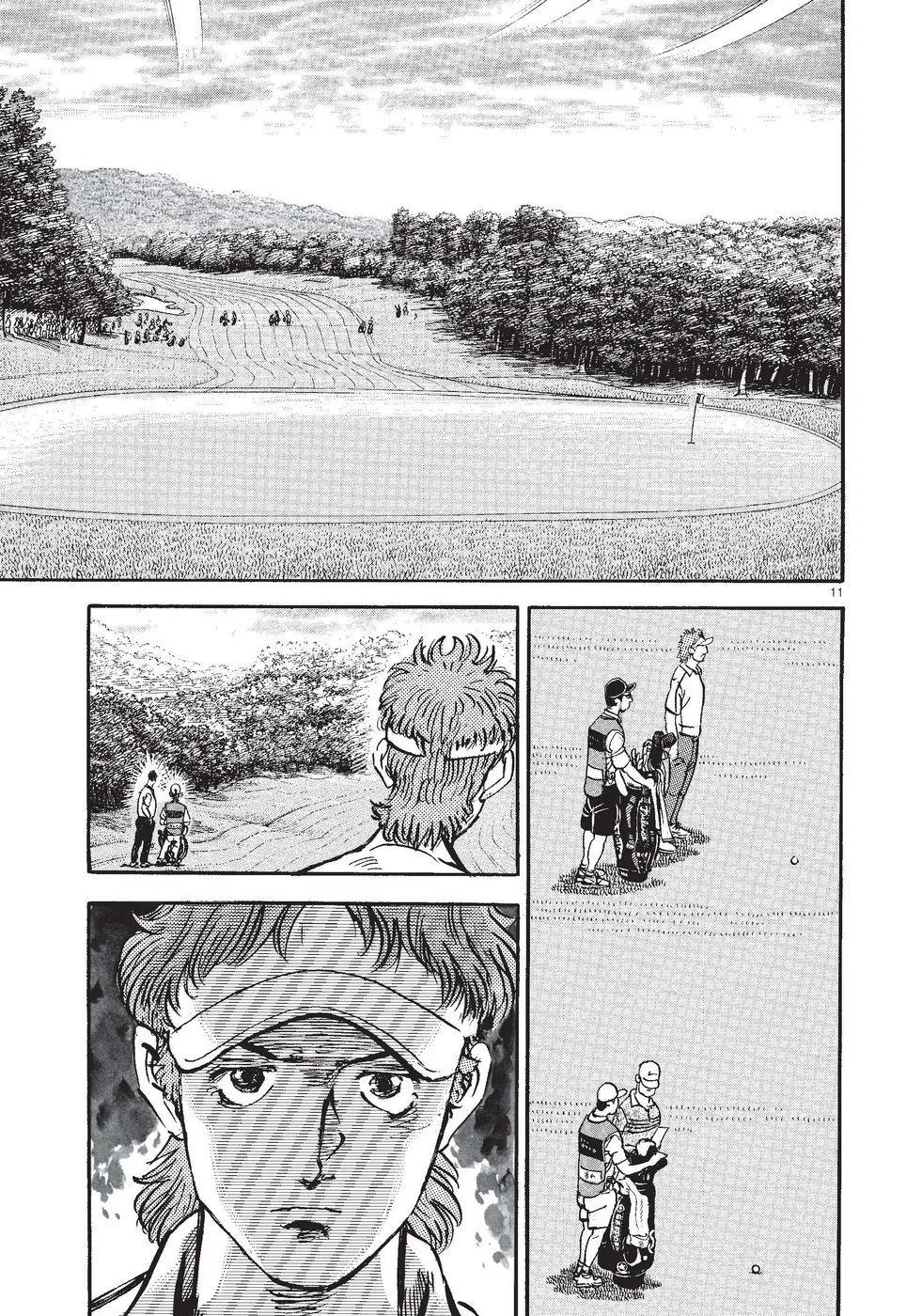 【第84巻あらすじ】KBSオーガスタ最終日。本阿弥尊と同組で7アンダー8位からのスタートとなった一丸。1番ホールにあの御園が突然現れ動揺したが、なんとかパーで切り抜け、迎えた2番、同組の時末の「ライジングパッド」に興味を抱いたことから、それをを見盗りボギーが先行。波に乗れないプレーが続く中、迎えた5番、尊のビッグドライブに影響されたか、第1打を右の林へ打ち込む。ところが第2打をカップに放り込み、連日のイーグル奪取!!負けじと尊もイーグルで食らいつきマッチプレー状態に。6番、トラブルショットをいきなり初めて握るグリップで打った一丸は……。