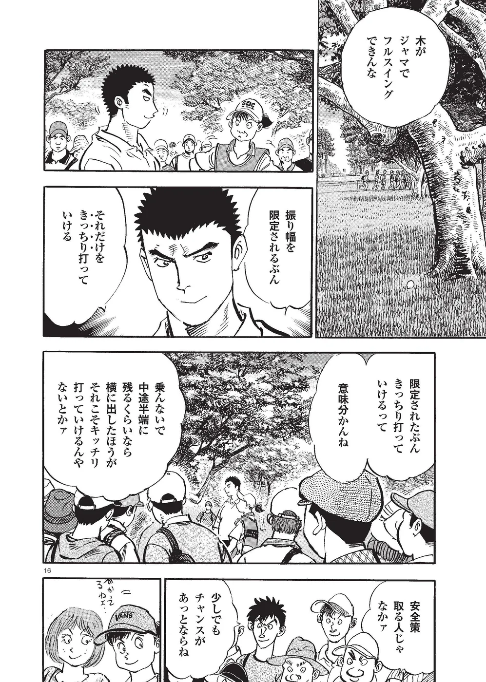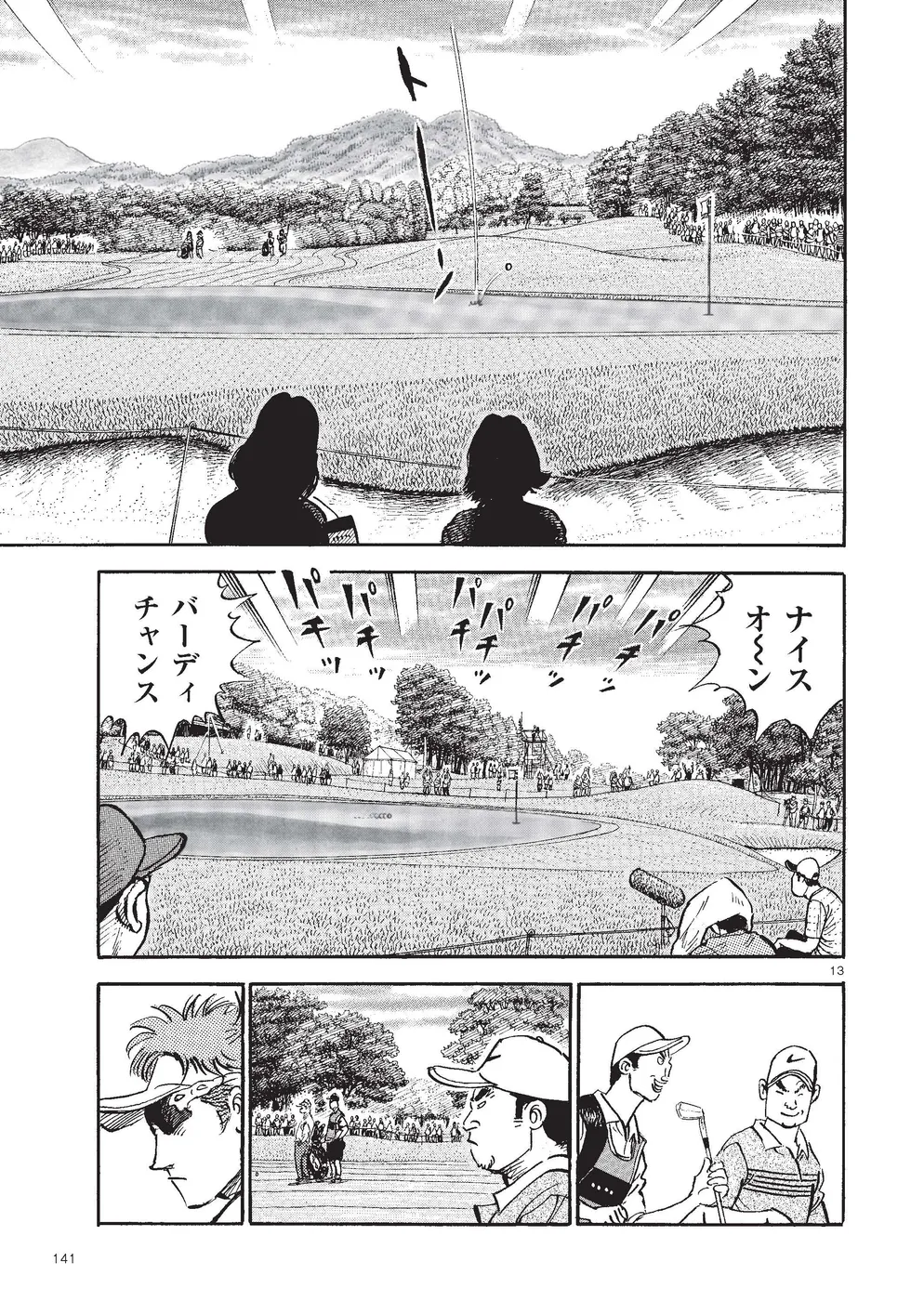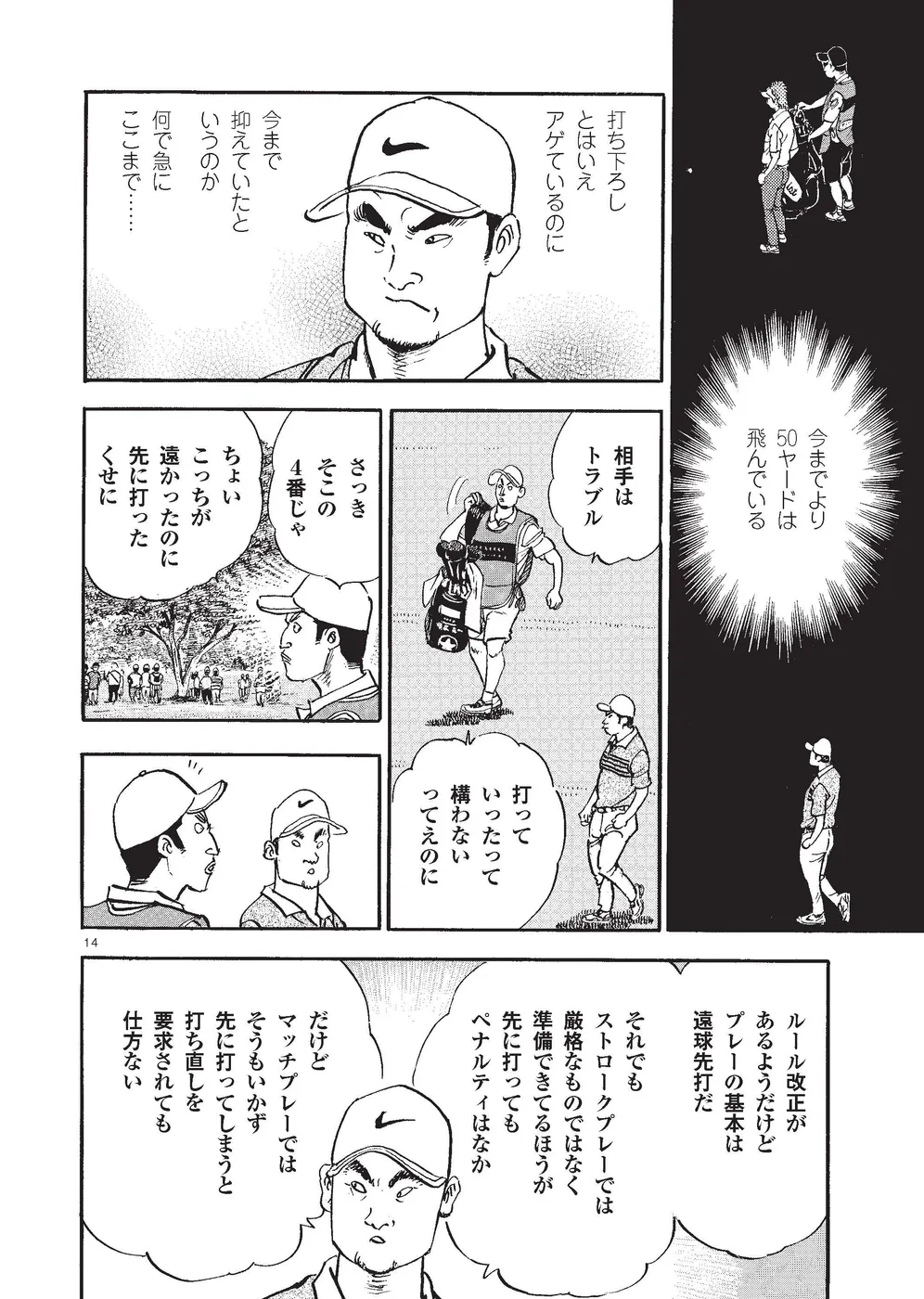 【第84巻あらすじ】KBSオーガスタ最終日。本阿弥尊と同組で7アンダー8位からのスタートとなった一丸。1番ホールにあの御園が突然現れ動揺したが、なんとかパーで切り抜け、迎えた2番、同組の時末の「ライジングパッド」に興味を抱いたことから、それをを見盗りボギーが先行。波に乗れないプレーが続く中、迎えた5番、尊のビッグドライブに影響されたか、第1打を右の林へ打ち込む。ところが第2打をカップに放り込み、連日のイーグル奪取!!負けじと尊もイーグルで食らいつきマッチプレー状態に。6番、トラブルショットをいきなり初めて握るグリップで打った一丸は……。