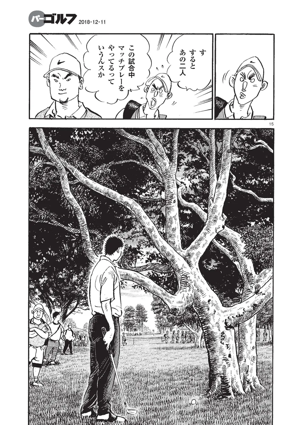 【第84巻あらすじ】KBSオーガスタ最終日。本阿弥尊と同組で7アンダー8位からのスタートとなった一丸。1番ホールにあの御園が突然現れ動揺したが、なんとかパーで切り抜け、迎えた2番、同組の時末の「ライジングパッド」に興味を抱いたことから、それをを見盗りボギーが先行。波に乗れないプレーが続く中、迎えた5番、尊のビッグドライブに影響されたか、第1打を右の林へ打ち込む。ところが第2打をカップに放り込み、連日のイーグル奪取!!負けじと尊もイーグルで食らいつきマッチプレー状態に。6番、トラブルショットをいきなり初めて握るグリップで打った一丸は……。
