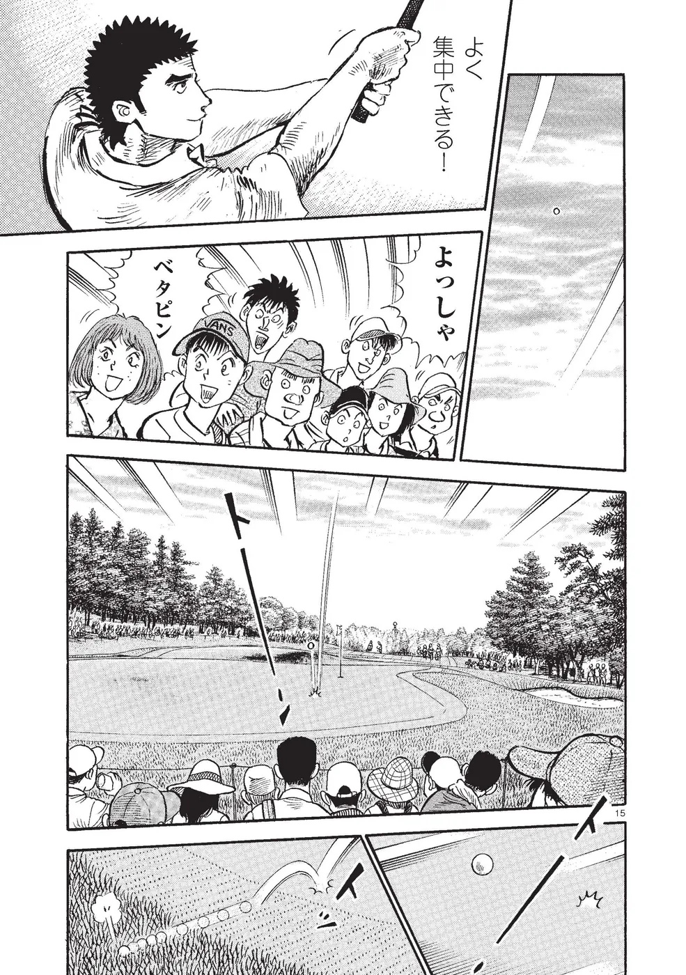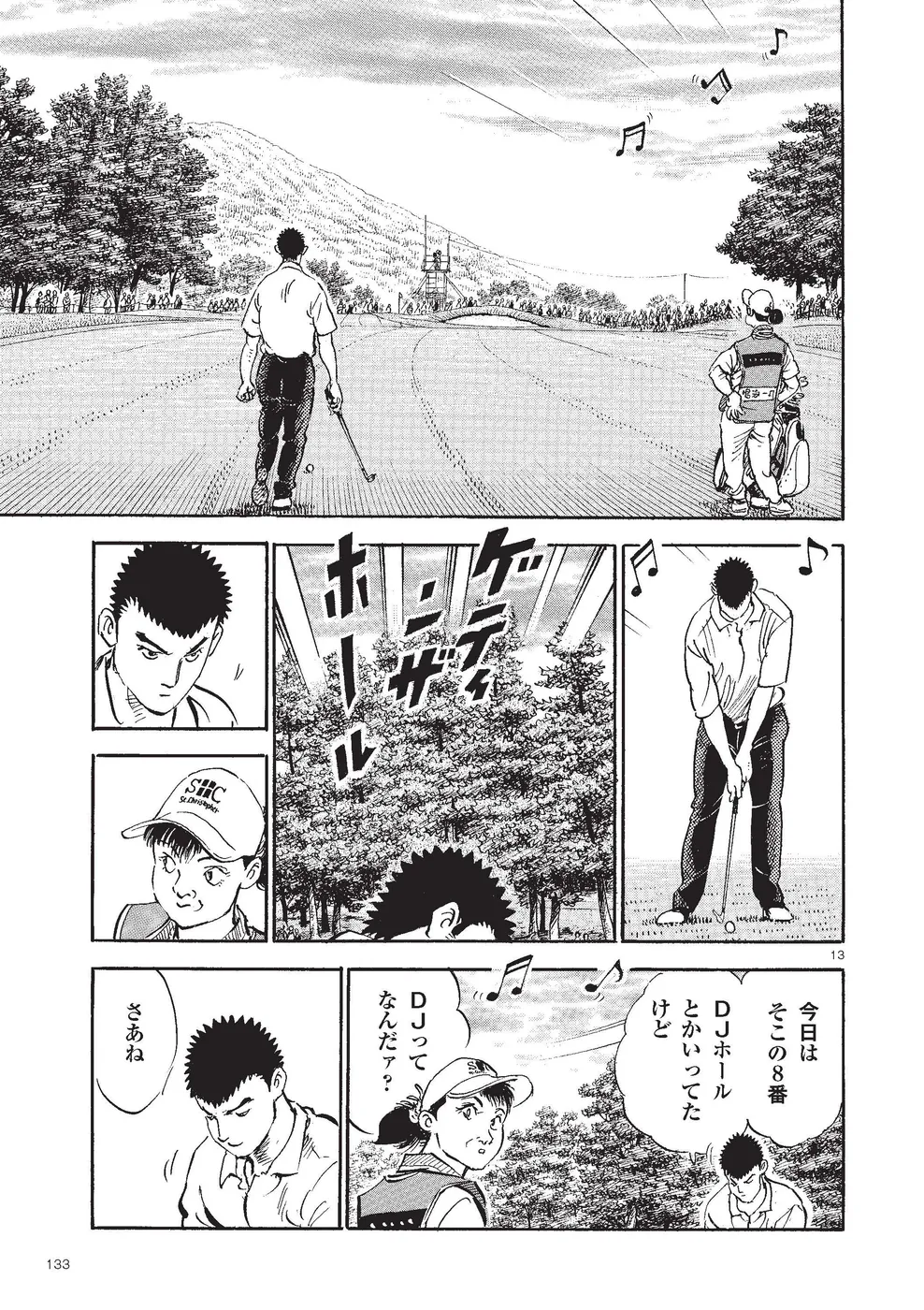 【第84巻あらすじ】KBSオーガスタ最終日。本阿弥尊と同組で7アンダー8位からのスタートとなった一丸。1番ホールにあの御園が突然現れ動揺したが、なんとかパーで切り抜け、迎えた2番、同組の時末の「ライジングパッド」に興味を抱いたことから、それをを見盗りボギーが先行。波に乗れないプレーが続く中、迎えた5番、尊のビッグドライブに影響されたか、第1打を右の林へ打ち込む。ところが第2打をカップに放り込み、連日のイーグル奪取!!負けじと尊もイーグルで食らいつきマッチプレー状態に。6番、トラブルショットをいきなり初めて握るグリップで打った一丸は……。