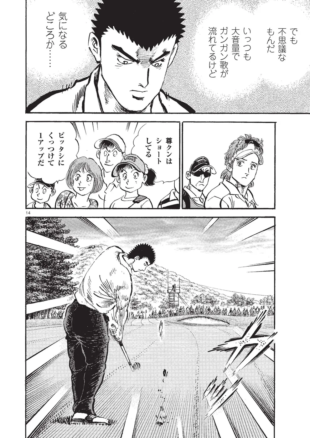 【第84巻あらすじ】KBSオーガスタ最終日。本阿弥尊と同組で7アンダー8位からのスタートとなった一丸。1番ホールにあの御園が突然現れ動揺したが、なんとかパーで切り抜け、迎えた2番、同組の時末の「ライジングパッド」に興味を抱いたことから、それをを見盗りボギーが先行。波に乗れないプレーが続く中、迎えた5番、尊のビッグドライブに影響されたか、第1打を右の林へ打ち込む。ところが第2打をカップに放り込み、連日のイーグル奪取!!負けじと尊もイーグルで食らいつきマッチプレー状態に。6番、トラブルショットをいきなり初めて握るグリップで打った一丸は……。