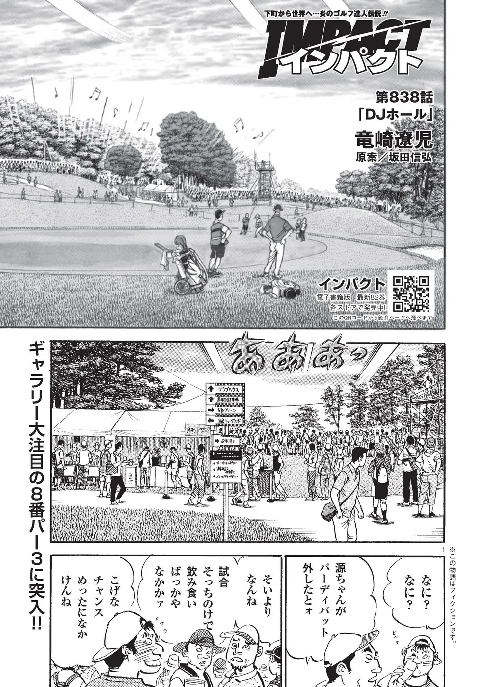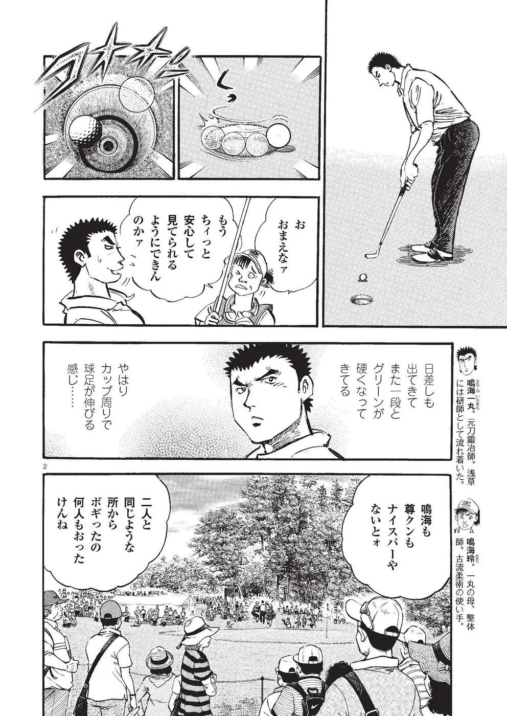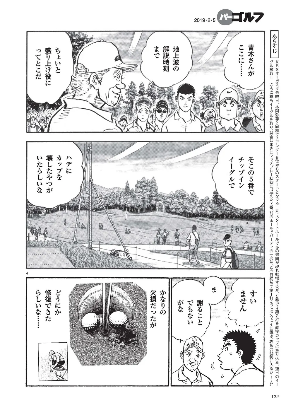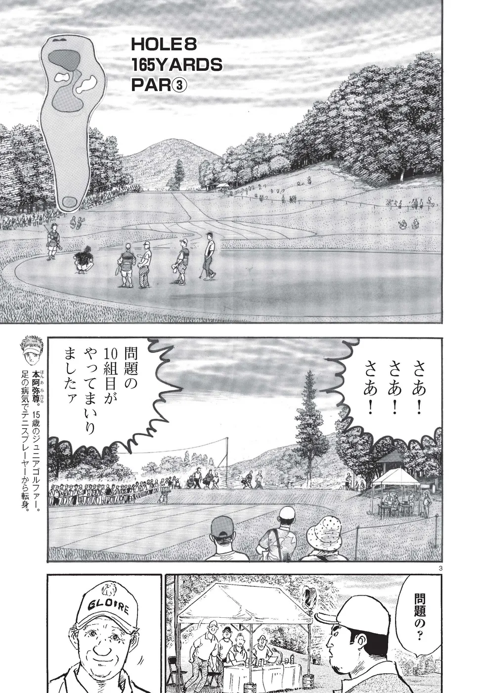 【第84巻あらすじ】KBSオーガスタ最終日。本阿弥尊と同組で7アンダー8位からのスタートとなった一丸。1番ホールにあの御園が突然現れ動揺したが、なんとかパーで切り抜け、迎えた2番、同組の時末の「ライジングパッド」に興味を抱いたことから、それをを見盗りボギーが先行。波に乗れないプレーが続く中、迎えた5番、尊のビッグドライブに影響されたか、第1打を右の林へ打ち込む。ところが第2打をカップに放り込み、連日のイーグル奪取!!負けじと尊もイーグルで食らいつきマッチプレー状態に。6番、トラブルショットをいきなり初めて握るグリップで打った一丸は……。