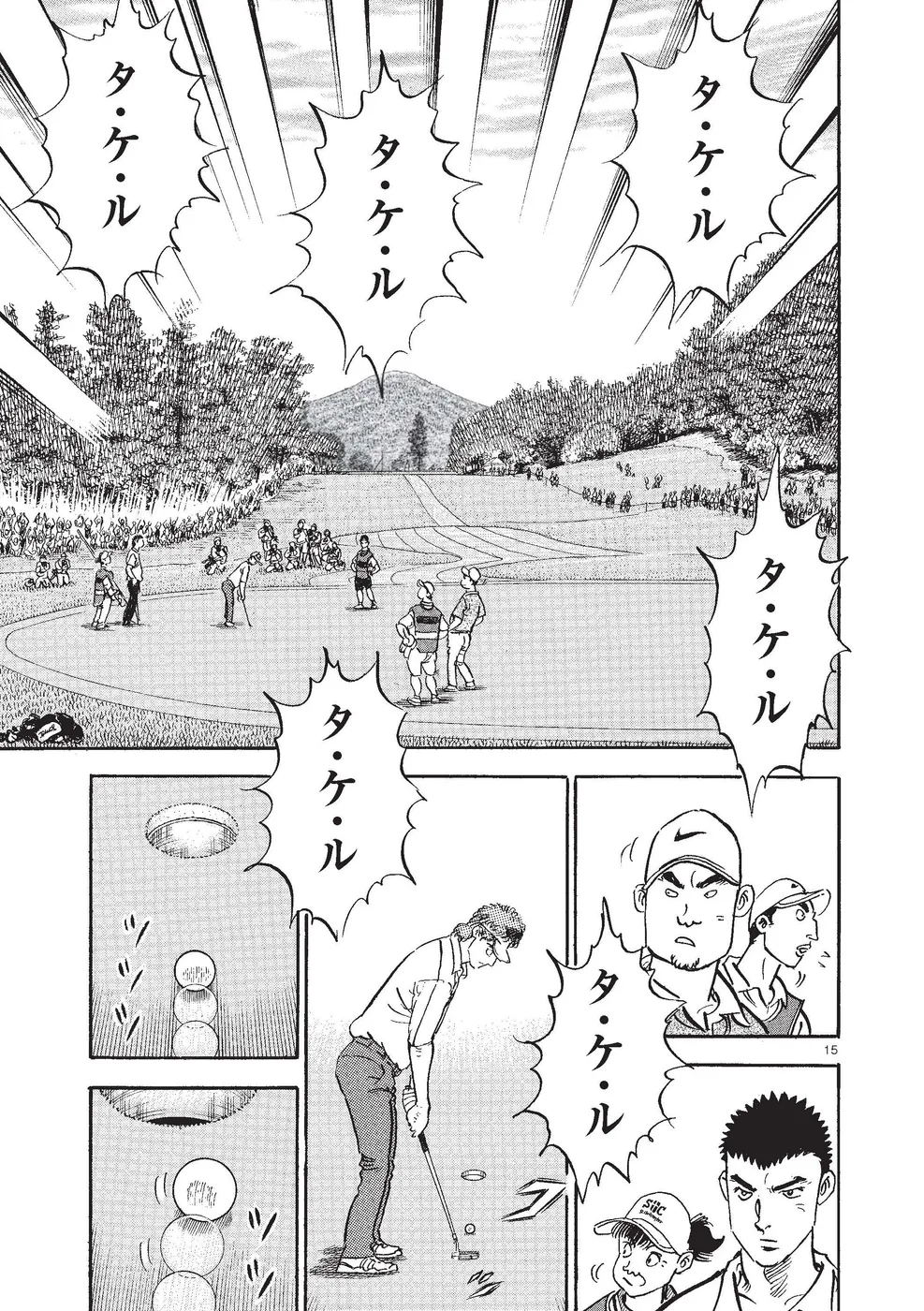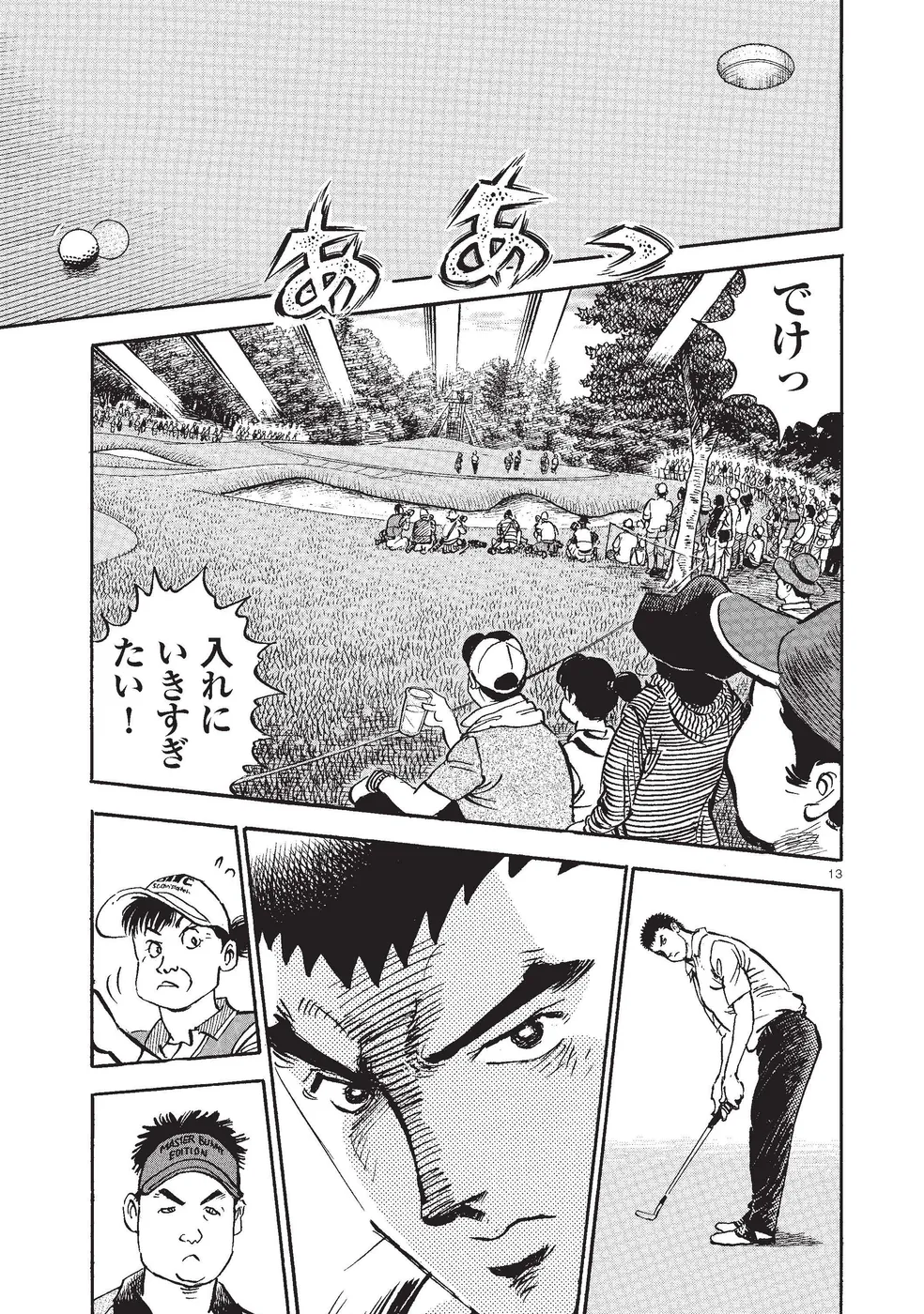 【第84巻あらすじ】KBSオーガスタ最終日。本阿弥尊と同組で7アンダー8位からのスタートとなった一丸。1番ホールにあの御園が突然現れ動揺したが、なんとかパーで切り抜け、迎えた2番、同組の時末の「ライジングパッド」に興味を抱いたことから、それをを見盗りボギーが先行。波に乗れないプレーが続く中、迎えた5番、尊のビッグドライブに影響されたか、第1打を右の林へ打ち込む。ところが第2打をカップに放り込み、連日のイーグル奪取!!負けじと尊もイーグルで食らいつきマッチプレー状態に。6番、トラブルショットをいきなり初めて握るグリップで打った一丸は……。