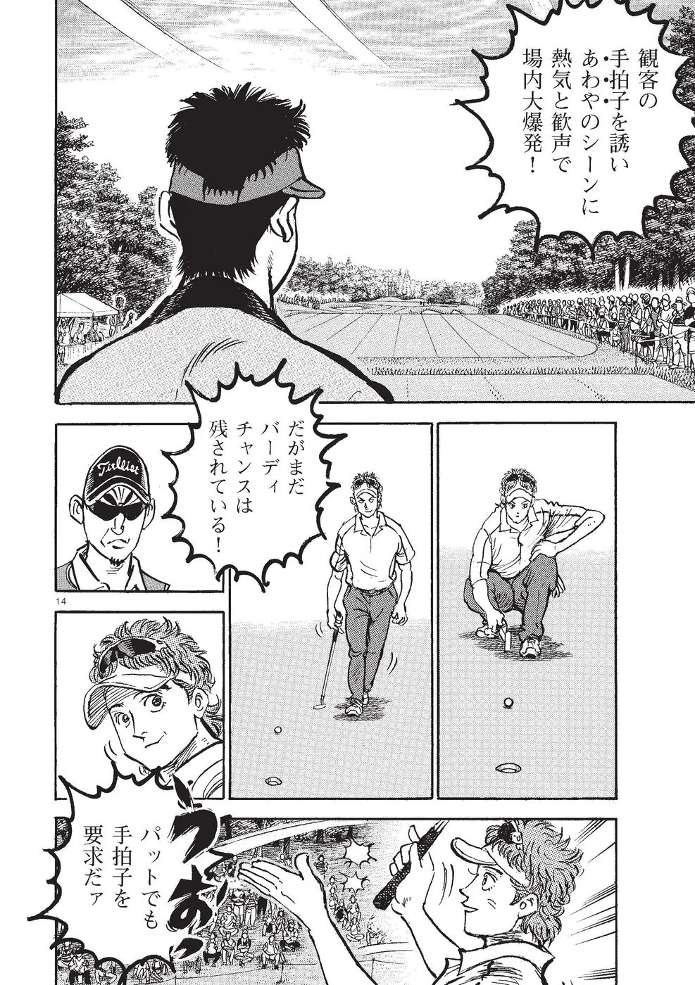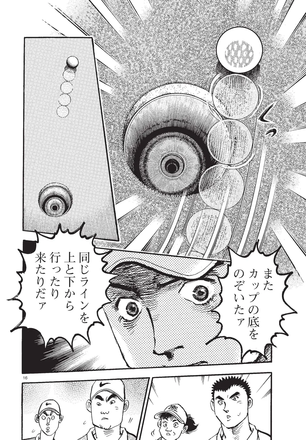 【第84巻あらすじ】KBSオーガスタ最終日。本阿弥尊と同組で7アンダー8位からのスタートとなった一丸。1番ホールにあの御園が突然現れ動揺したが、なんとかパーで切り抜け、迎えた2番、同組の時末の「ライジングパッド」に興味を抱いたことから、それをを見盗りボギーが先行。波に乗れないプレーが続く中、迎えた5番、尊のビッグドライブに影響されたか、第1打を右の林へ打ち込む。ところが第2打をカップに放り込み、連日のイーグル奪取!!負けじと尊もイーグルで食らいつきマッチプレー状態に。6番、トラブルショットをいきなり初めて握るグリップで打った一丸は……。