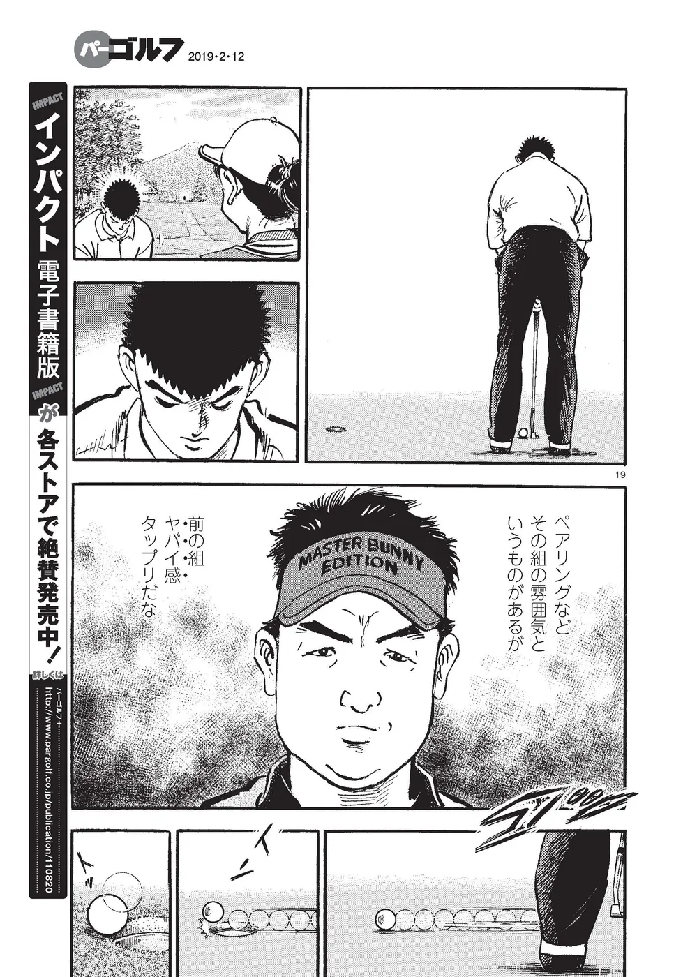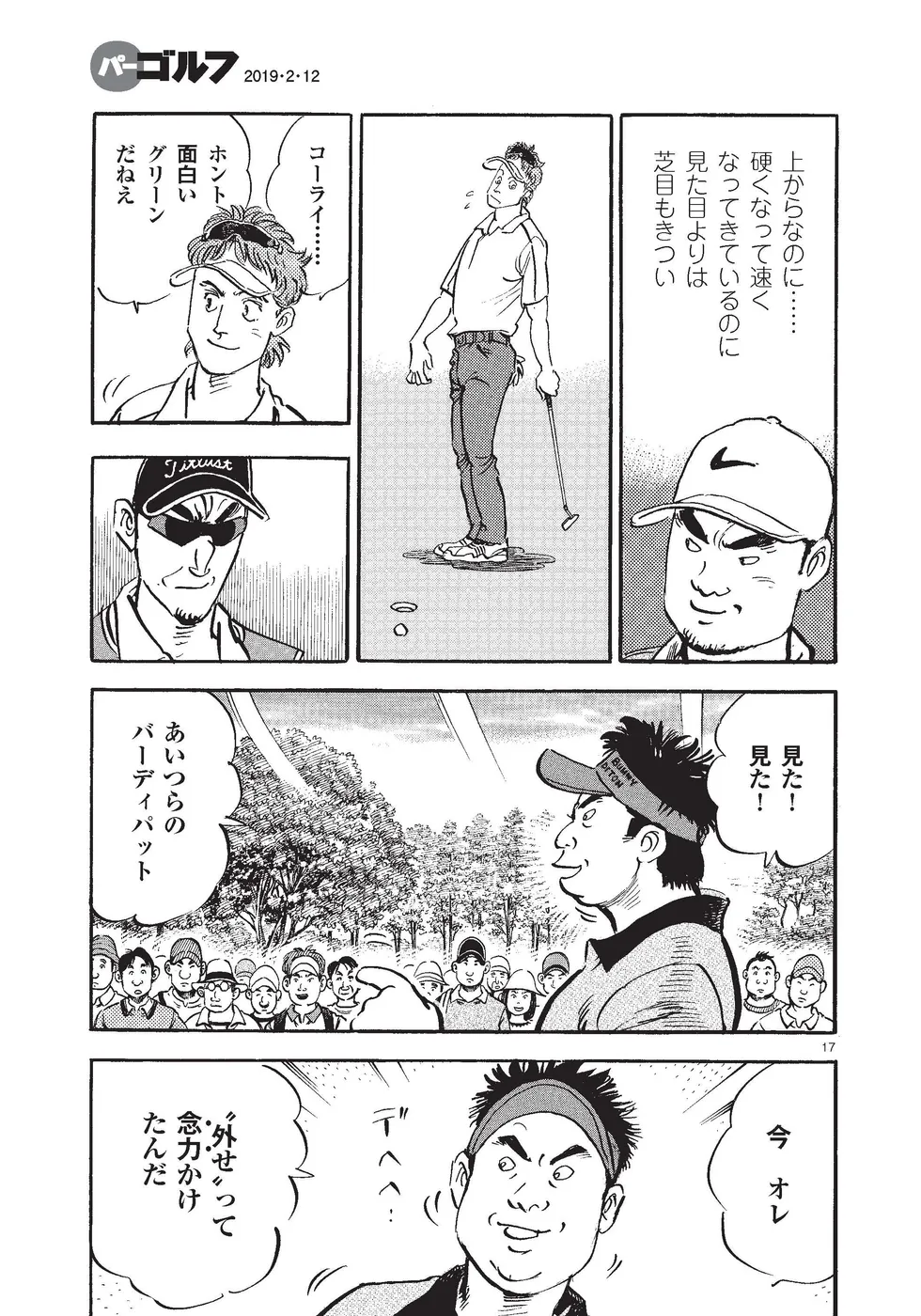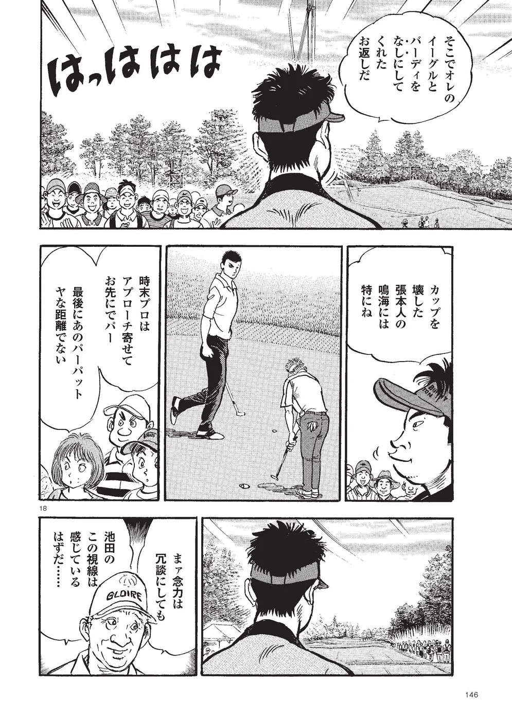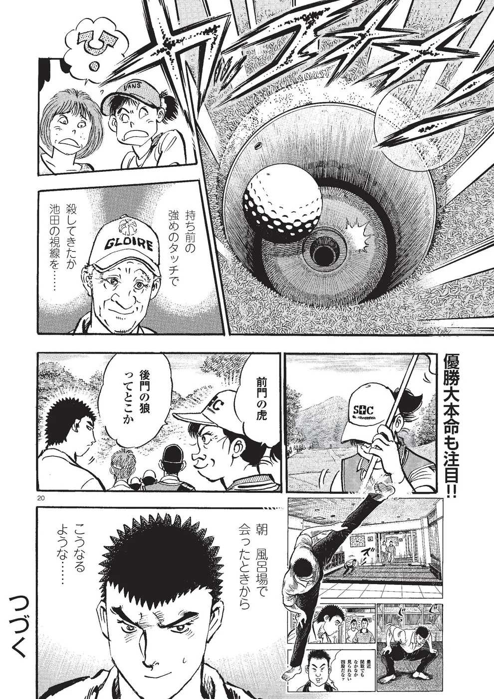 【第84巻あらすじ】KBSオーガスタ最終日。本阿弥尊と同組で7アンダー8位からのスタートとなった一丸。1番ホールにあの御園が突然現れ動揺したが、なんとかパーで切り抜け、迎えた2番、同組の時末の「ライジングパッド」に興味を抱いたことから、それをを見盗りボギーが先行。波に乗れないプレーが続く中、迎えた5番、尊のビッグドライブに影響されたか、第1打を右の林へ打ち込む。ところが第2打をカップに放り込み、連日のイーグル奪取!!負けじと尊もイーグルで食らいつきマッチプレー状態に。6番、トラブルショットをいきなり初めて握るグリップで打った一丸は……。