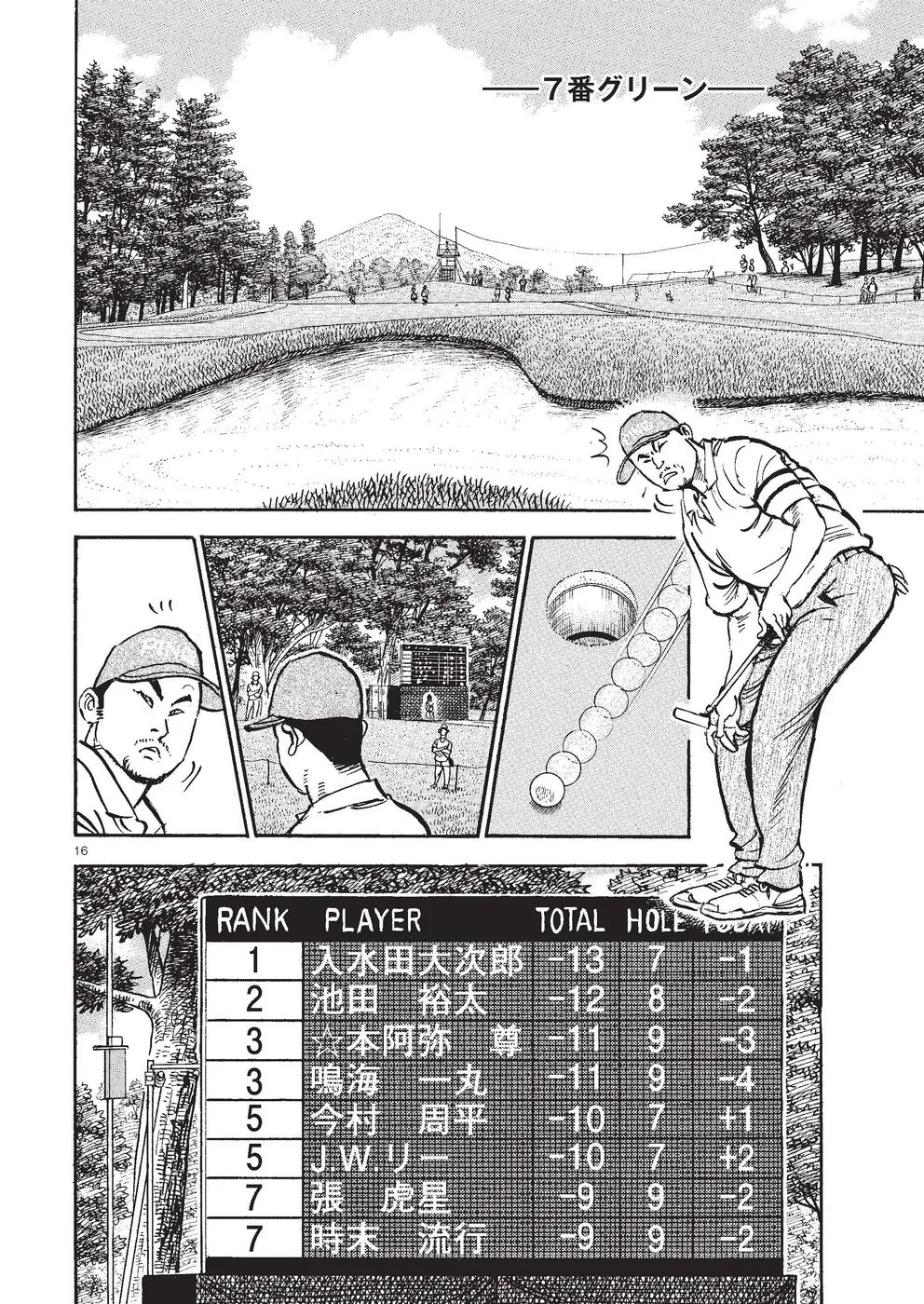 【第85巻あらすじ】KBSオーガスタ最終日、本阿弥尊と同組7アンダー、8位からのスタートとなった主人公一丸。5番ホールでは第2打を直接カップに放り込みイーグル奪取。さらに尊もイーグルで追従し、試合はマッチプレー状態に突入する。そんな中、一丸は同組の時末のスイングを知らずのうちに己の中に取り込み、武道家としての自分本来のスイングを作りかけていた。15番を終え、尊とは3打差2ダウン。最終ホールに向かう中、調子が上向く一丸に勝機はあるのか!?下町から世界へ!炎のゴルフ達人伝説がついに完結!