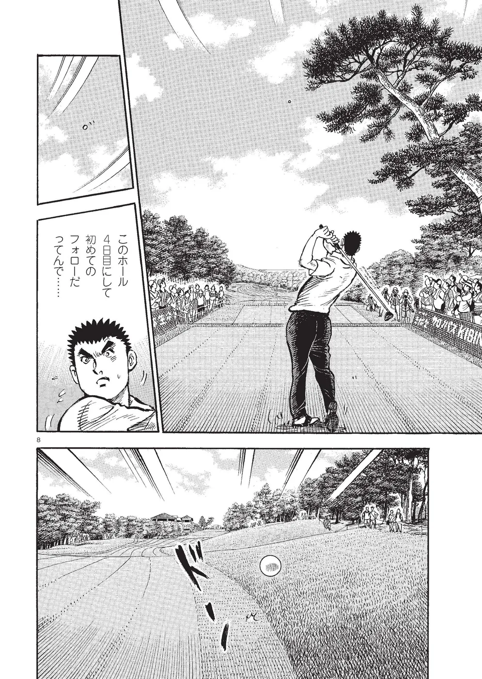 【第85巻あらすじ】KBSオーガスタ最終日、本阿弥尊と同組7アンダー、8位からのスタートとなった主人公一丸。5番ホールでは第2打を直接カップに放り込みイーグル奪取。さらに尊もイーグルで追従し、試合はマッチプレー状態に突入する。そんな中、一丸は同組の時末のスイングを知らずのうちに己の中に取り込み、武道家としての自分本来のスイングを作りかけていた。15番を終え、尊とは3打差2ダウン。最終ホールに向かう中、調子が上向く一丸に勝機はあるのか!?下町から世界へ!炎のゴルフ達人伝説がついに完結!
