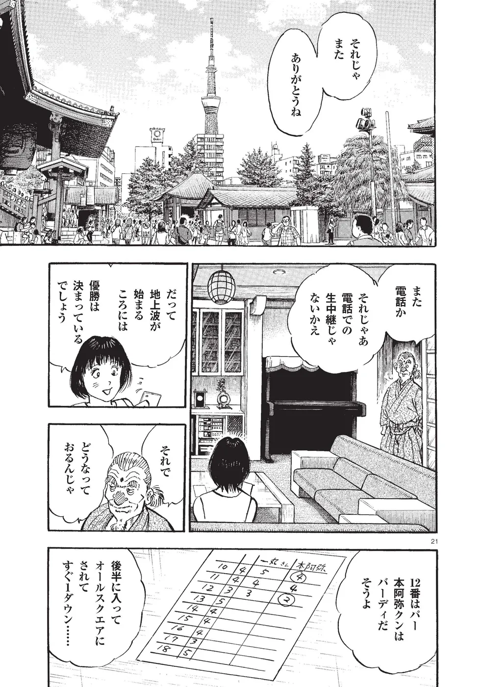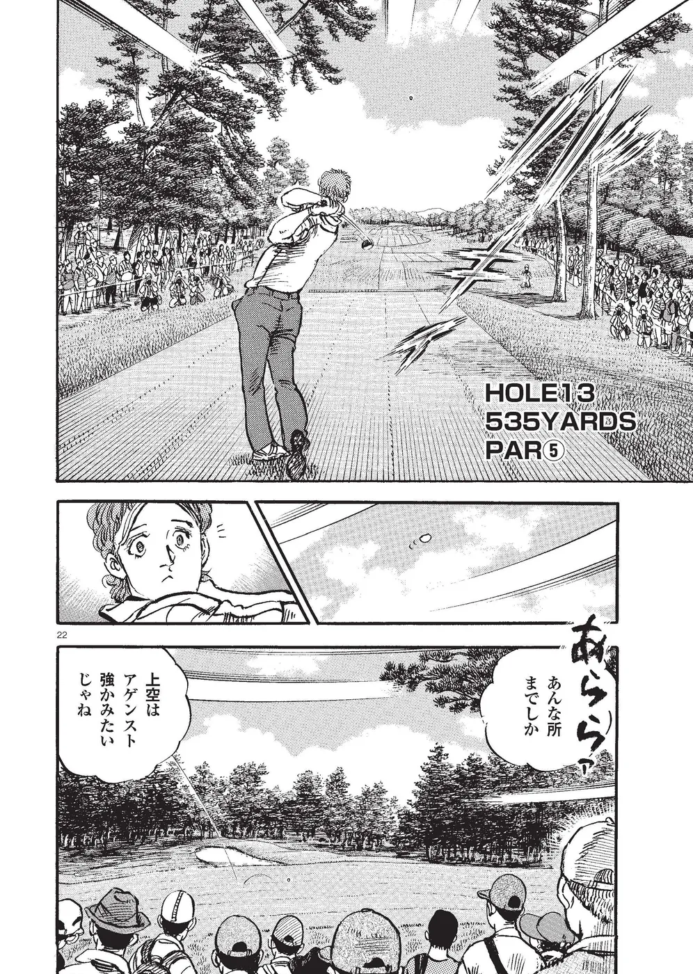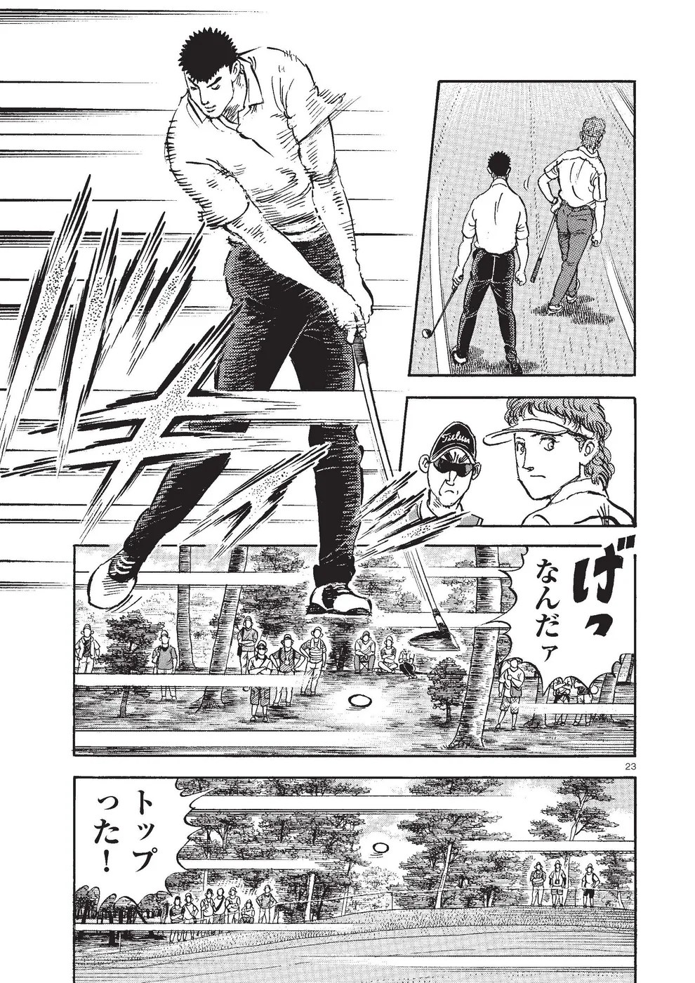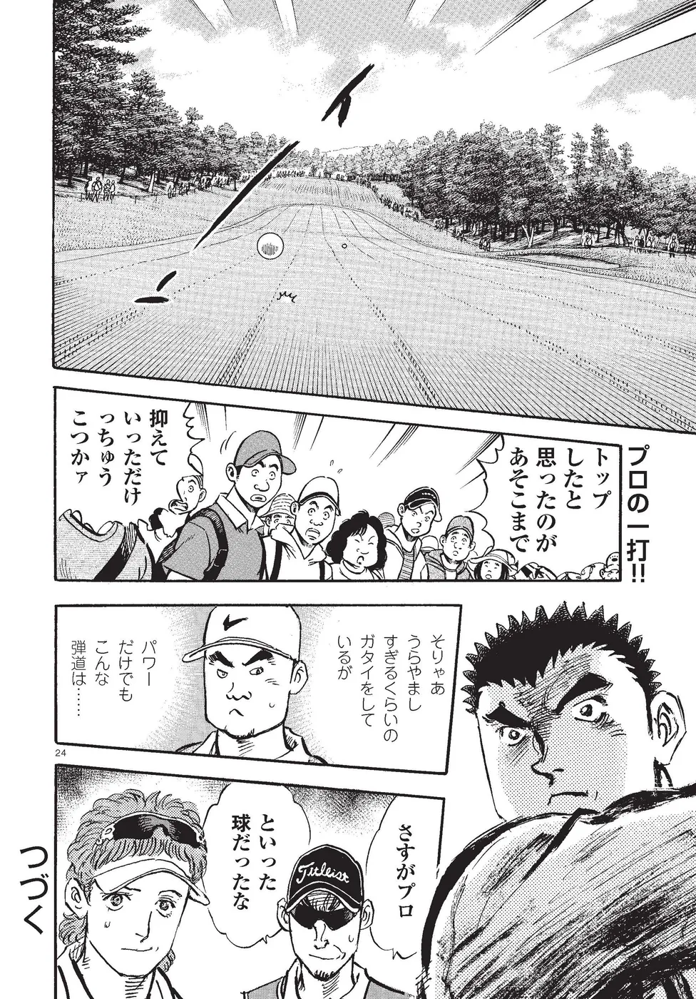 【第85巻あらすじ】KBSオーガスタ最終日、本阿弥尊と同組7アンダー、8位からのスタートとなった主人公一丸。5番ホールでは第2打を直接カップに放り込みイーグル奪取。さらに尊もイーグルで追従し、試合はマッチプレー状態に突入する。そんな中、一丸は同組の時末のスイングを知らずのうちに己の中に取り込み、武道家としての自分本来のスイングを作りかけていた。15番を終え、尊とは3打差2ダウン。最終ホールに向かう中、調子が上向く一丸に勝機はあるのか!?下町から世界へ!炎のゴルフ達人伝説がついに完結!