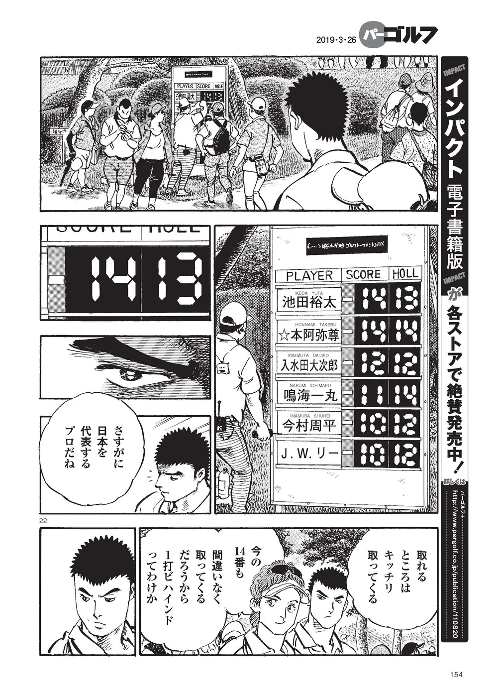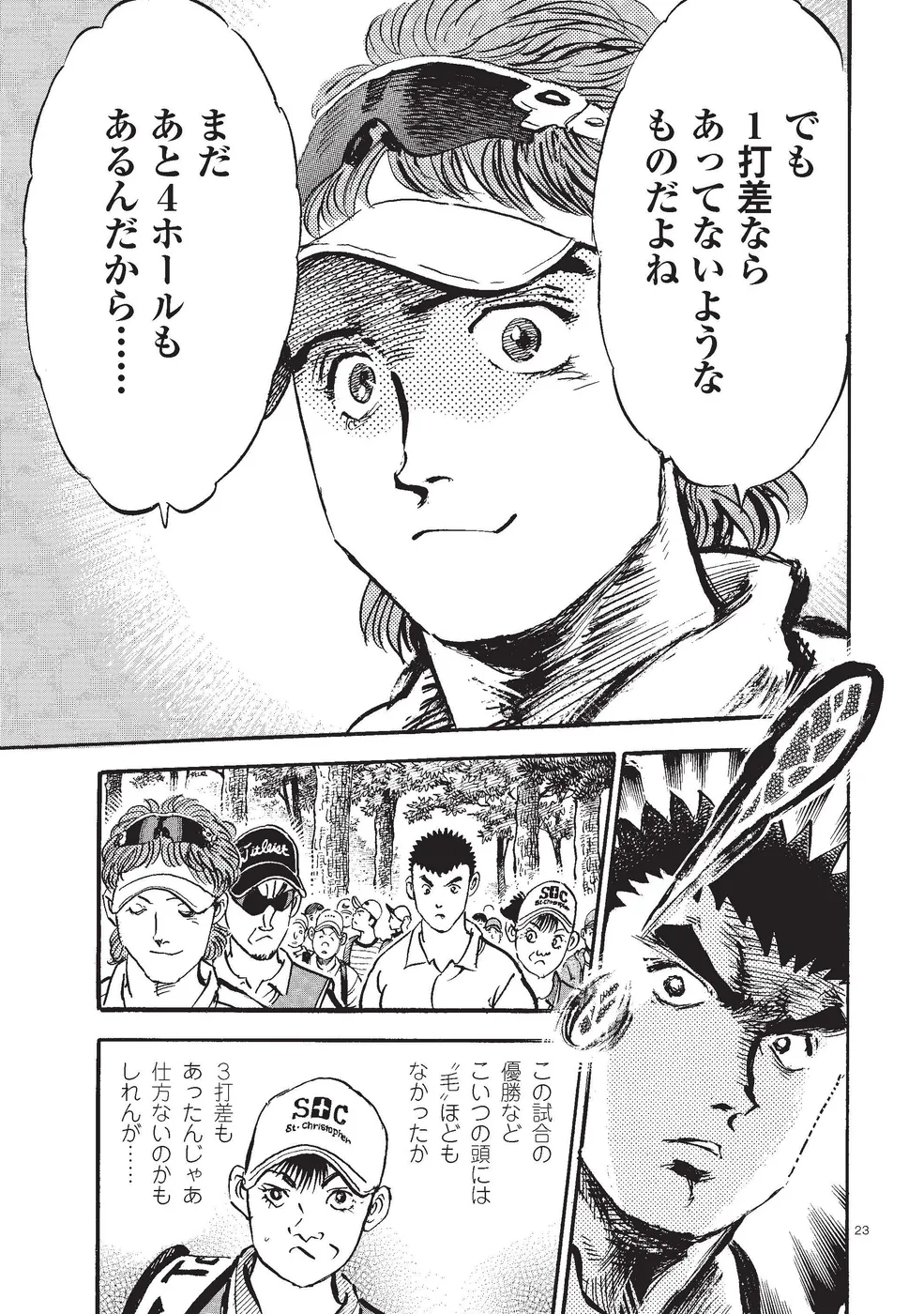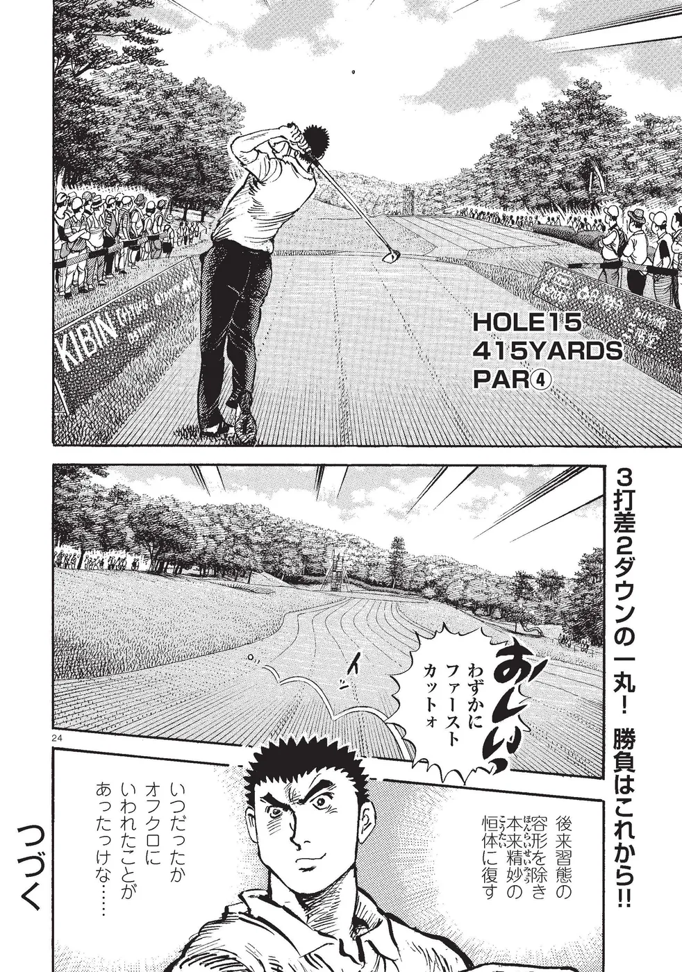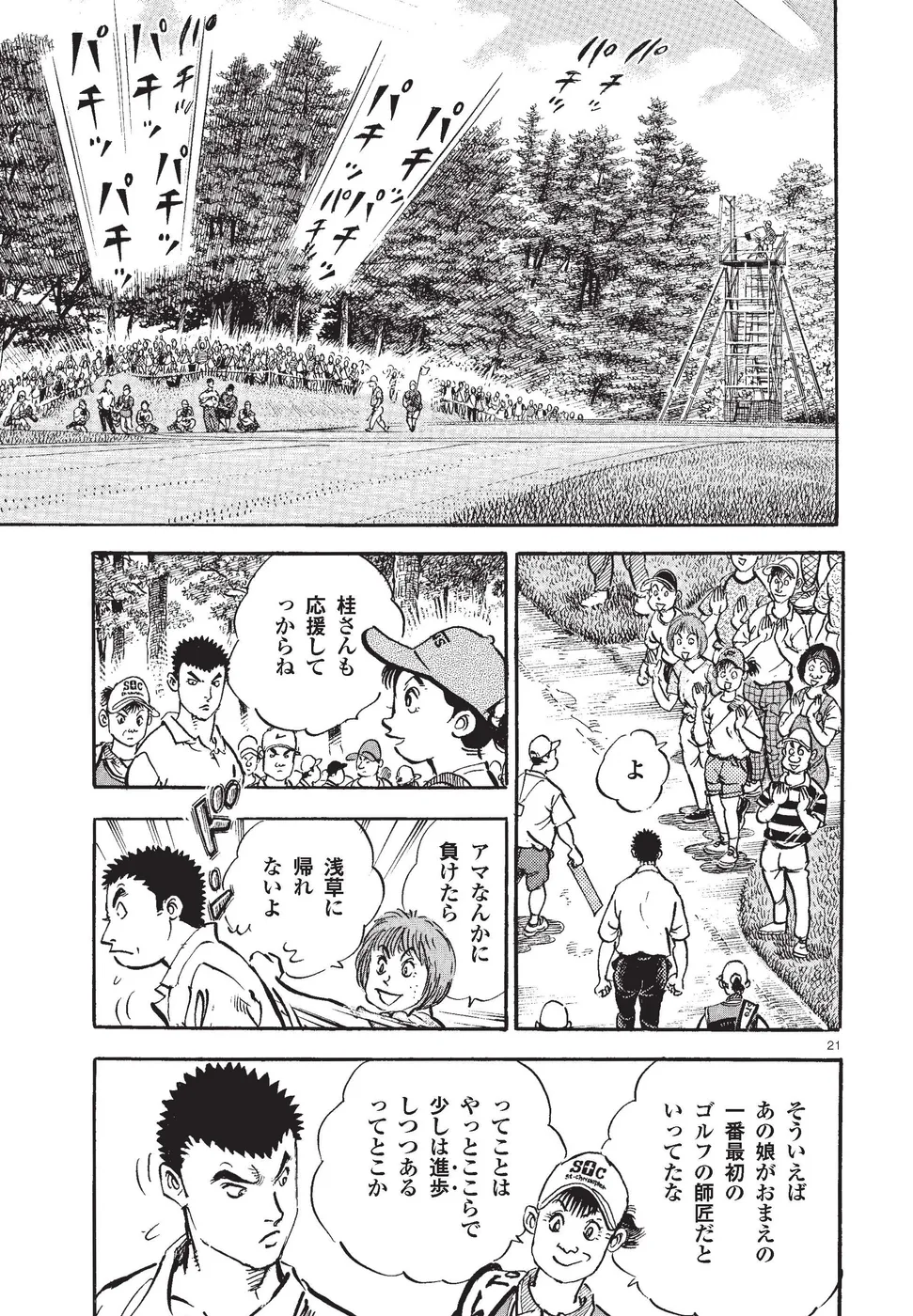 【第85巻あらすじ】KBSオーガスタ最終日、本阿弥尊と同組7アンダー、8位からのスタートとなった主人公一丸。5番ホールでは第2打を直接カップに放り込みイーグル奪取。さらに尊もイーグルで追従し、試合はマッチプレー状態に突入する。そんな中、一丸は同組の時末のスイングを知らずのうちに己の中に取り込み、武道家としての自分本来のスイングを作りかけていた。15番を終え、尊とは3打差2ダウン。最終ホールに向かう中、調子が上向く一丸に勝機はあるのか!?下町から世界へ!炎のゴルフ達人伝説がついに完結!