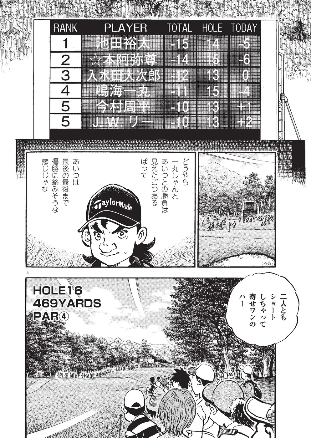 【第85巻あらすじ】KBSオーガスタ最終日、本阿弥尊と同組7アンダー、8位からのスタートとなった主人公一丸。5番ホールでは第2打を直接カップに放り込みイーグル奪取。さらに尊もイーグルで追従し、試合はマッチプレー状態に突入する。そんな中、一丸は同組の時末のスイングを知らずのうちに己の中に取り込み、武道家としての自分本来のスイングを作りかけていた。15番を終え、尊とは3打差2ダウン。最終ホールに向かう中、調子が上向く一丸に勝機はあるのか!?下町から世界へ!炎のゴルフ達人伝説がついに完結!