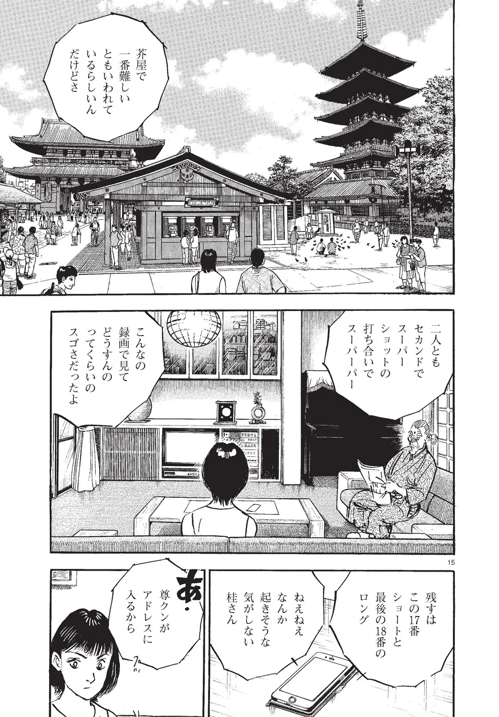 【第85巻あらすじ】KBSオーガスタ最終日、本阿弥尊と同組7アンダー、8位からのスタートとなった主人公一丸。5番ホールでは第2打を直接カップに放り込みイーグル奪取。さらに尊もイーグルで追従し、試合はマッチプレー状態に突入する。そんな中、一丸は同組の時末のスイングを知らずのうちに己の中に取り込み、武道家としての自分本来のスイングを作りかけていた。15番を終え、尊とは3打差2ダウン。最終ホールに向かう中、調子が上向く一丸に勝機はあるのか!?下町から世界へ!炎のゴルフ達人伝説がついに完結!