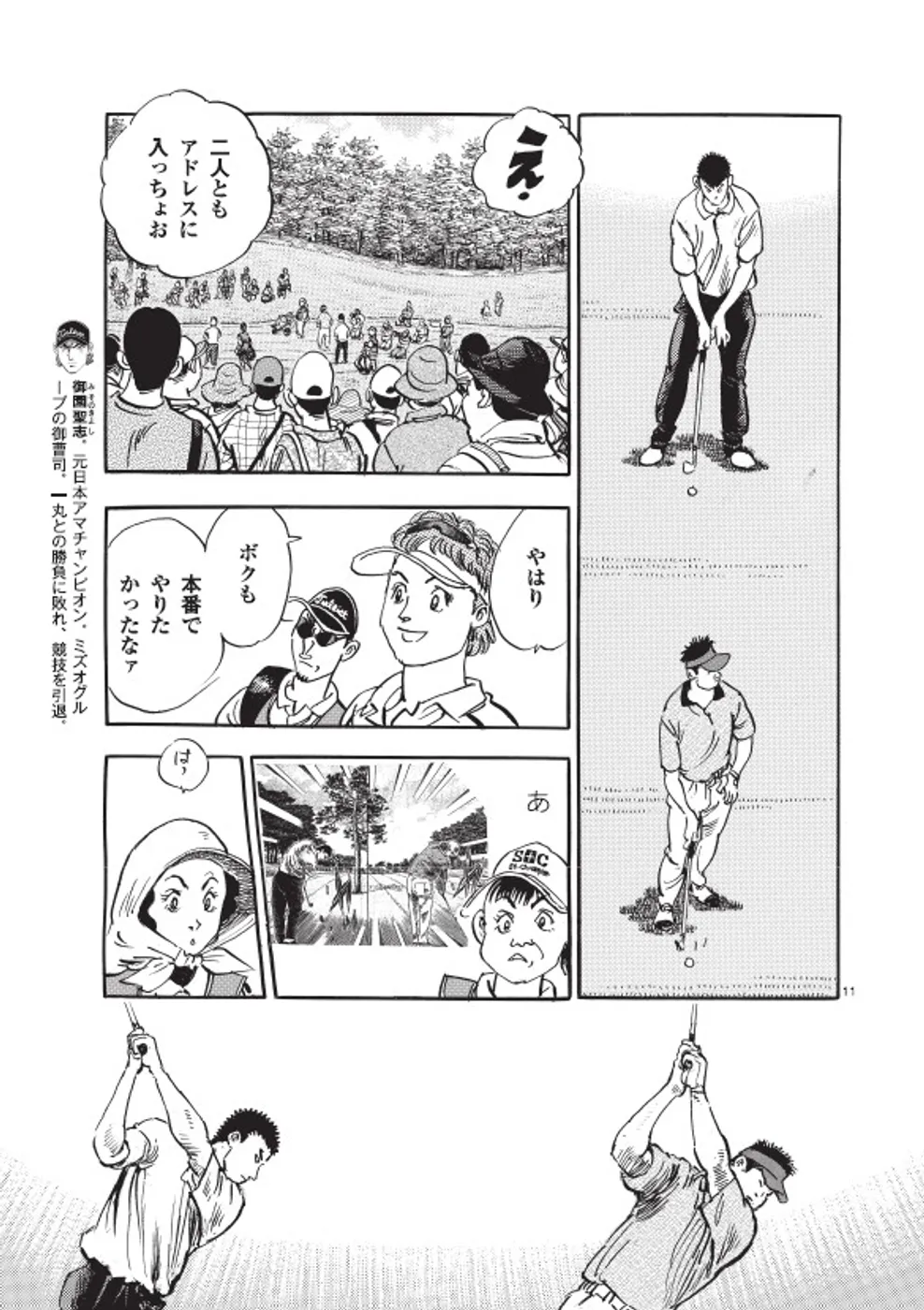 【第85巻あらすじ】KBSオーガスタ最終日、本阿弥尊と同組7アンダー、8位からのスタートとなった主人公一丸。5番ホールでは第2打を直接カップに放り込みイーグル奪取。さらに尊もイーグルで追従し、試合はマッチプレー状態に突入する。そんな中、一丸は同組の時末のスイングを知らずのうちに己の中に取り込み、武道家としての自分本来のスイングを作りかけていた。15番を終え、尊とは3打差2ダウン。最終ホールに向かう中、調子が上向く一丸に勝機はあるのか!?下町から世界へ!炎のゴルフ達人伝説がついに完結!