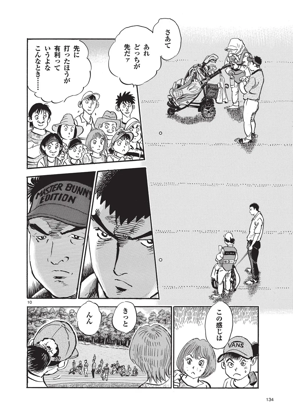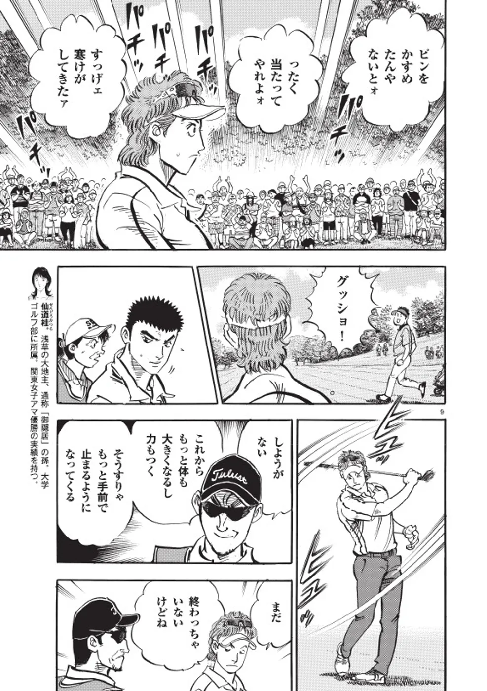 【第85巻あらすじ】KBSオーガスタ最終日、本阿弥尊と同組7アンダー、8位からのスタートとなった主人公一丸。5番ホールでは第2打を直接カップに放り込みイーグル奪取。さらに尊もイーグルで追従し、試合はマッチプレー状態に突入する。そんな中、一丸は同組の時末のスイングを知らずのうちに己の中に取り込み、武道家としての自分本来のスイングを作りかけていた。15番を終え、尊とは3打差2ダウン。最終ホールに向かう中、調子が上向く一丸に勝機はあるのか!?下町から世界へ!炎のゴルフ達人伝説がついに完結!