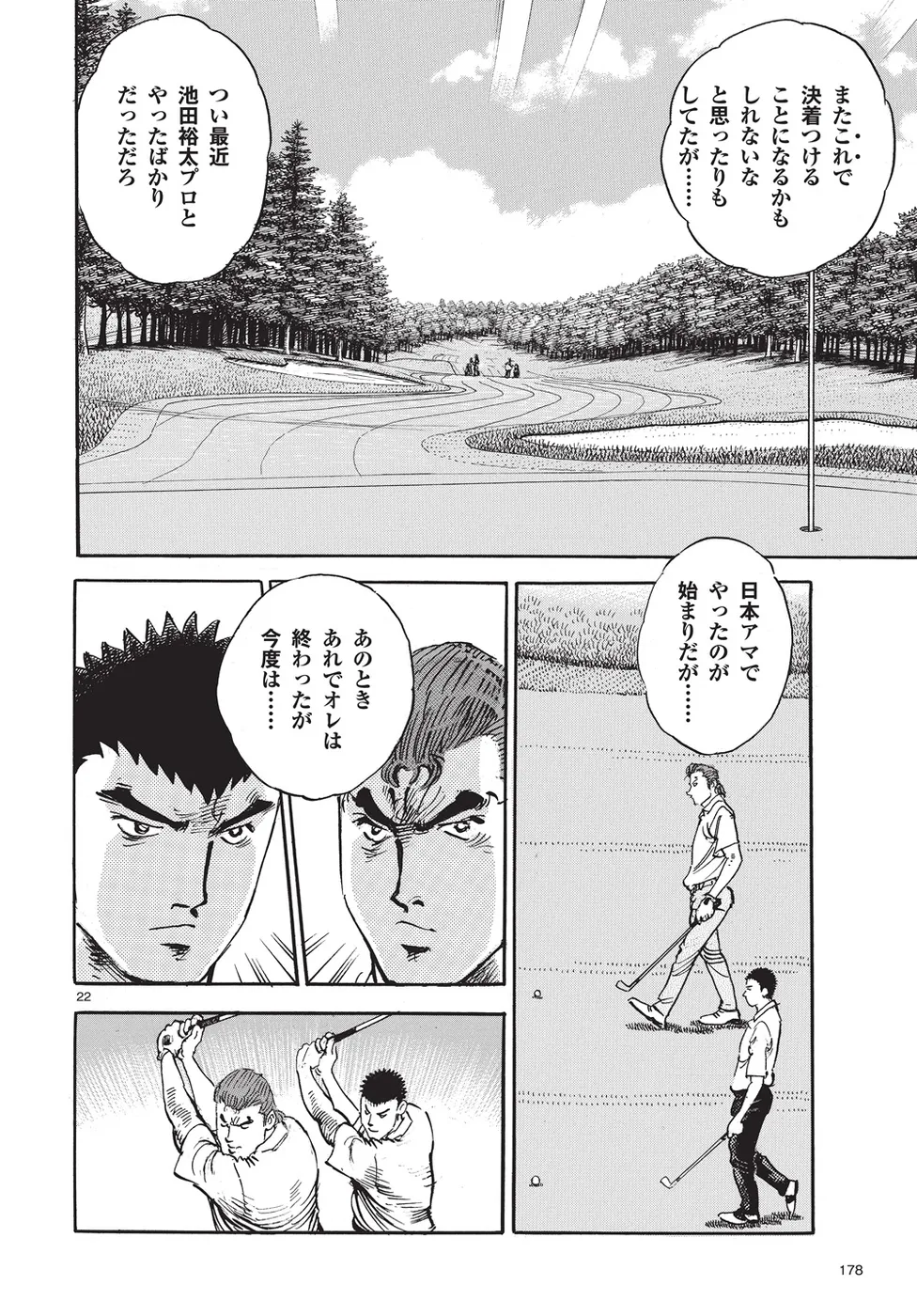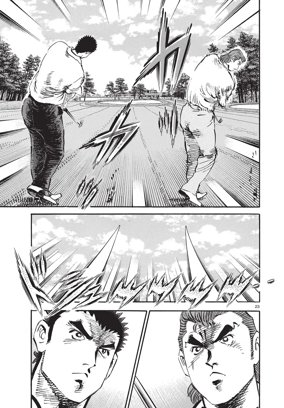 【第85巻あらすじ】KBSオーガスタ最終日、本阿弥尊と同組7アンダー、8位からのスタートとなった主人公一丸。5番ホールでは第2打を直接カップに放り込みイーグル奪取。さらに尊もイーグルで追従し、試合はマッチプレー状態に突入する。そんな中、一丸は同組の時末のスイングを知らずのうちに己の中に取り込み、武道家としての自分本来のスイングを作りかけていた。15番を終え、尊とは3打差2ダウン。最終ホールに向かう中、調子が上向く一丸に勝機はあるのか!?下町から世界へ!炎のゴルフ達人伝説がついに完結!