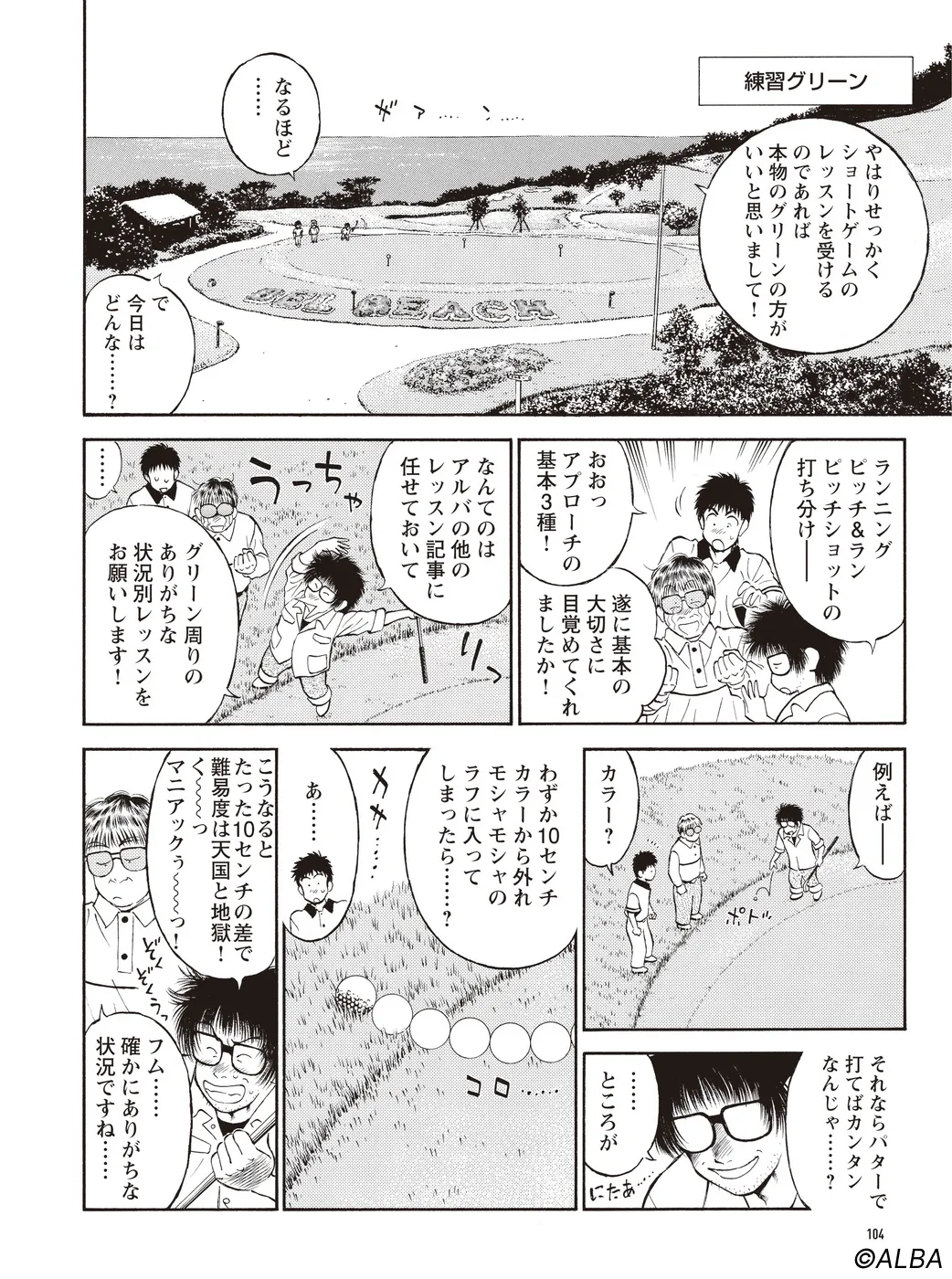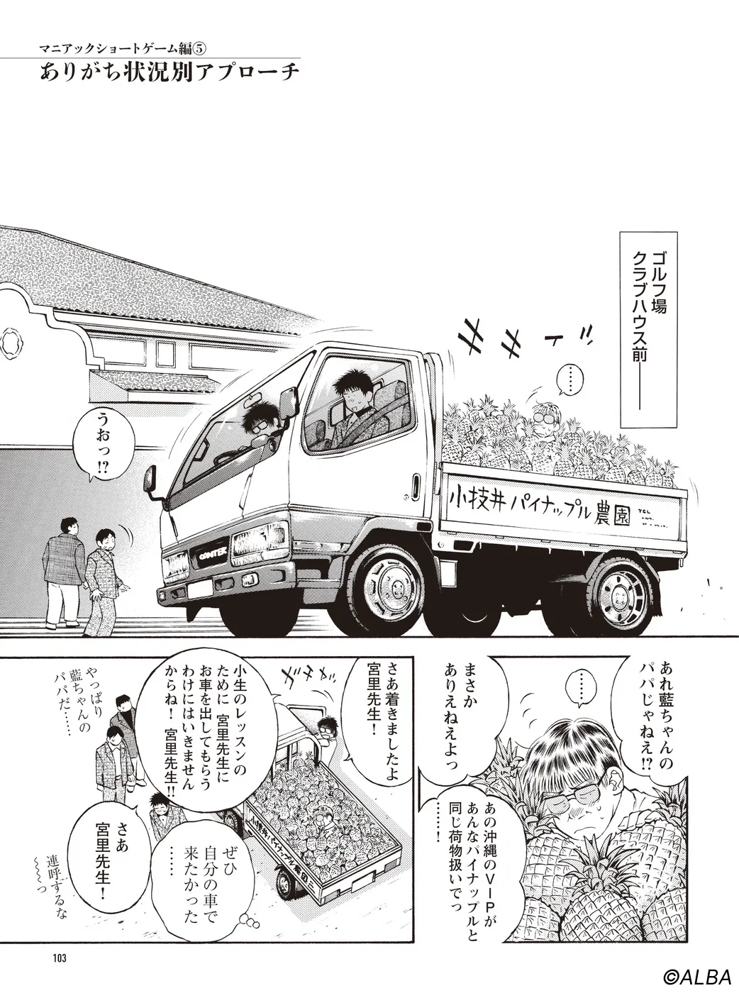 【マニアックショートゲーム編|シリーズ概要】今回の生徒は、ショートゲーム命のマニアック野郎・小技井 乃智(こわざい のち)。神出鬼没、頭でっかちで偏屈…厄介な門下生に振り回される宮里優、聖志、百太郎の面々だが、好奇心をもって指導を受け止める小技井に、宮里流のイマジネーションを伝授する。(指導:宮里優/脚本:かわさき健/作画:本島幸久)