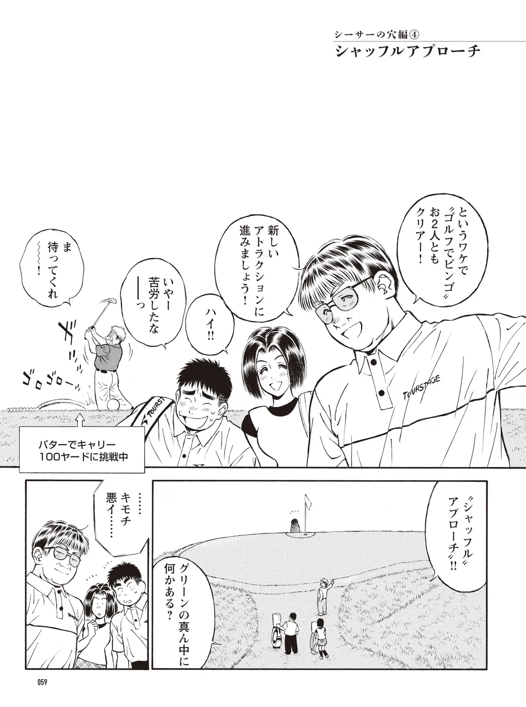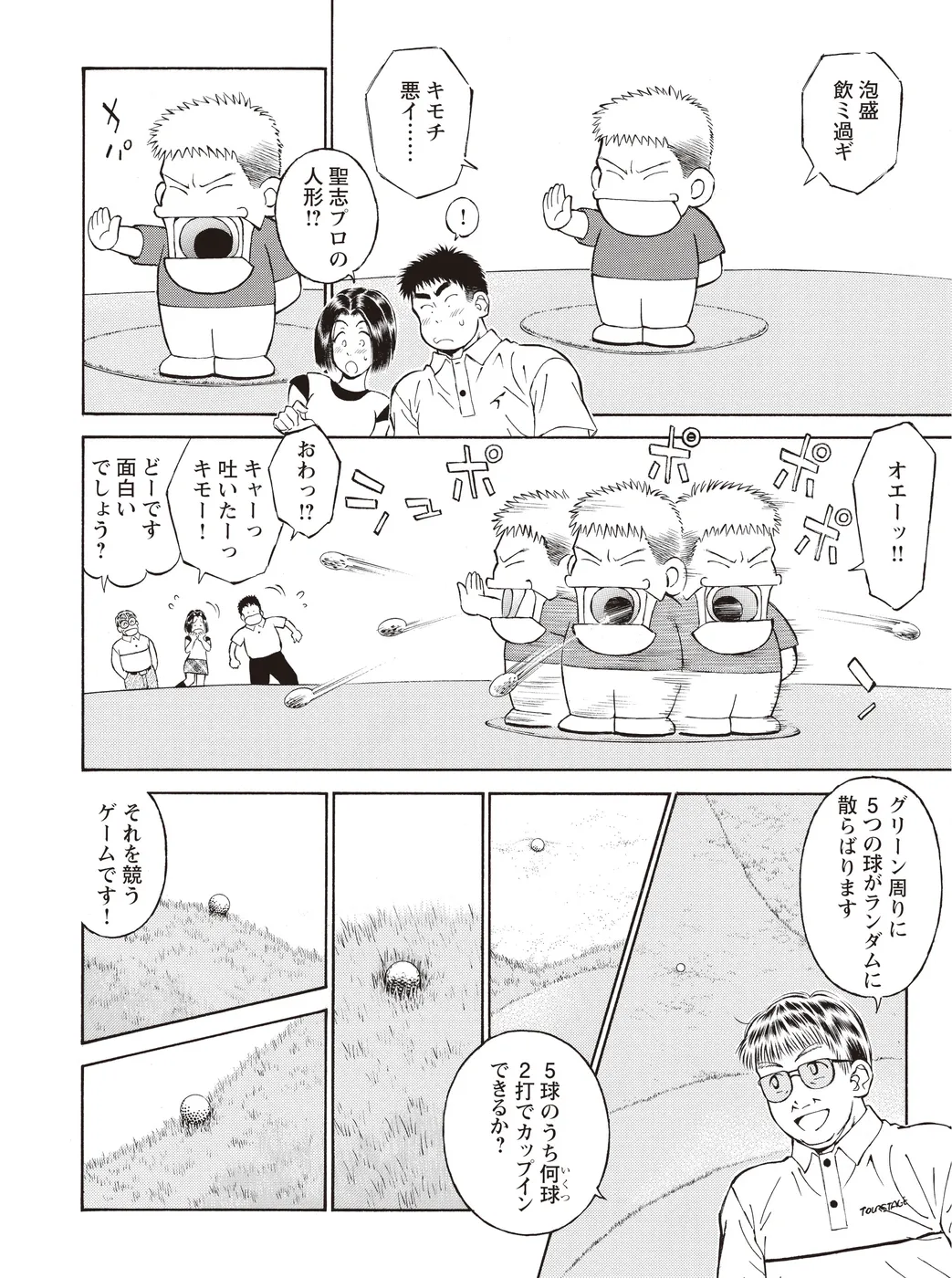 【シーサーの穴編|シリーズ概要】宮里道場を訪れた兄妹、飯玉南乃二(いいたま なのに)と飯玉卯津代(いいたま うつよ)。「スイングはいいのに…」と悩む兄に対し、“練習場シングル”から脱却させ、宮里流のゴルフ力を伝授するべく、ゴルフテーマパーク“シーサーの穴”へと導く。(指導:宮里優/脚本:かわさき健/作画:本島幸久)