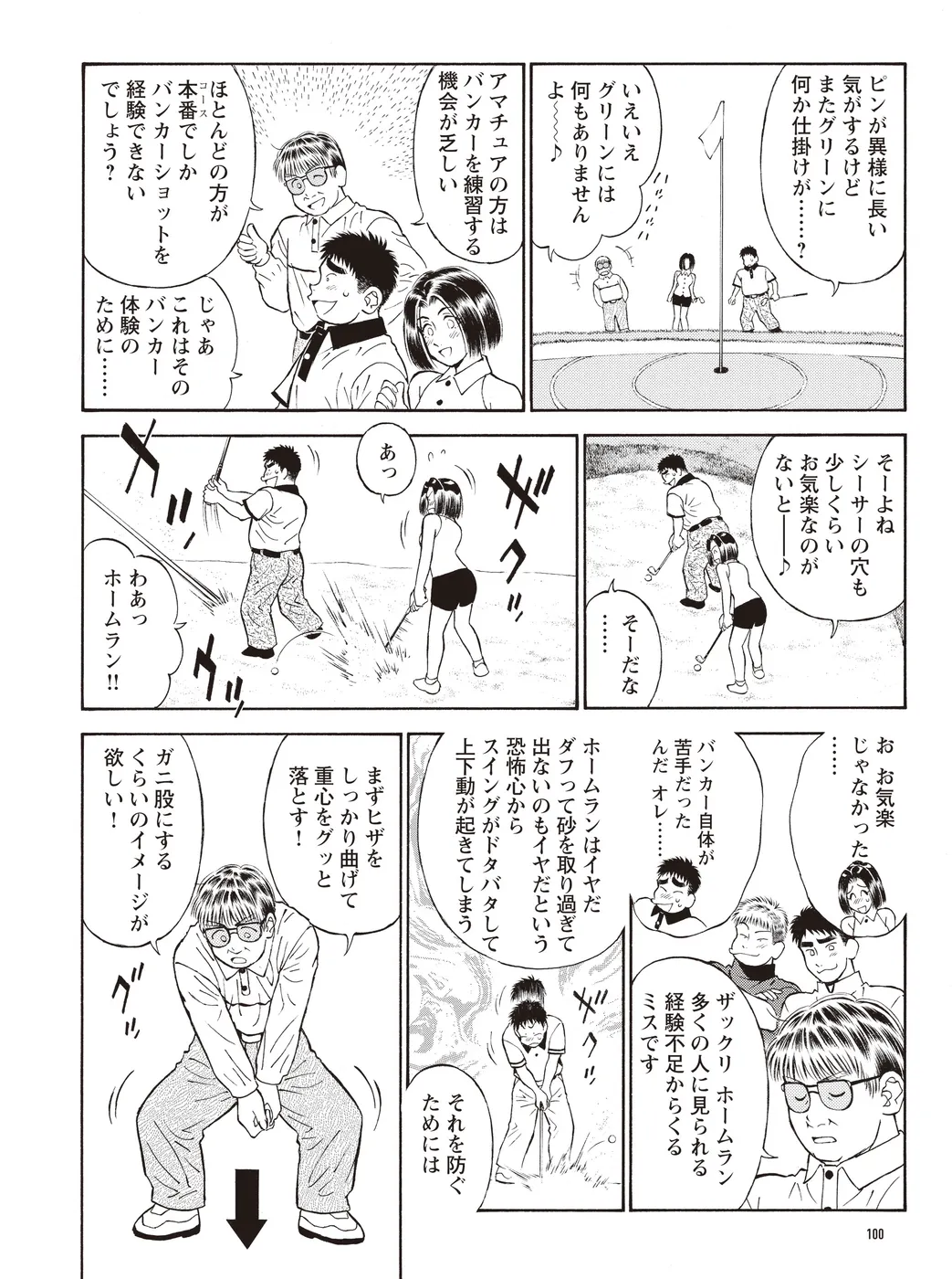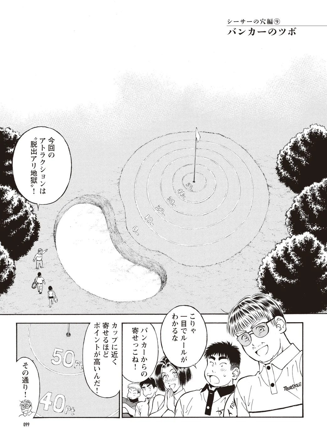 【シーサーの穴編|シリーズ概要】宮里道場を訪れた兄妹、飯玉南乃二(いいたま なのに)と飯玉卯津代(いいたま うつよ)。「スイングはいいのに…」と悩む兄に対し、“練習場シングル”から脱却させ、宮里流のゴルフ力を伝授するべく、ゴルフテーマパーク“シーサーの穴”へと導く。(指導:宮里優/脚本:かわさき健/作画:本島幸久)