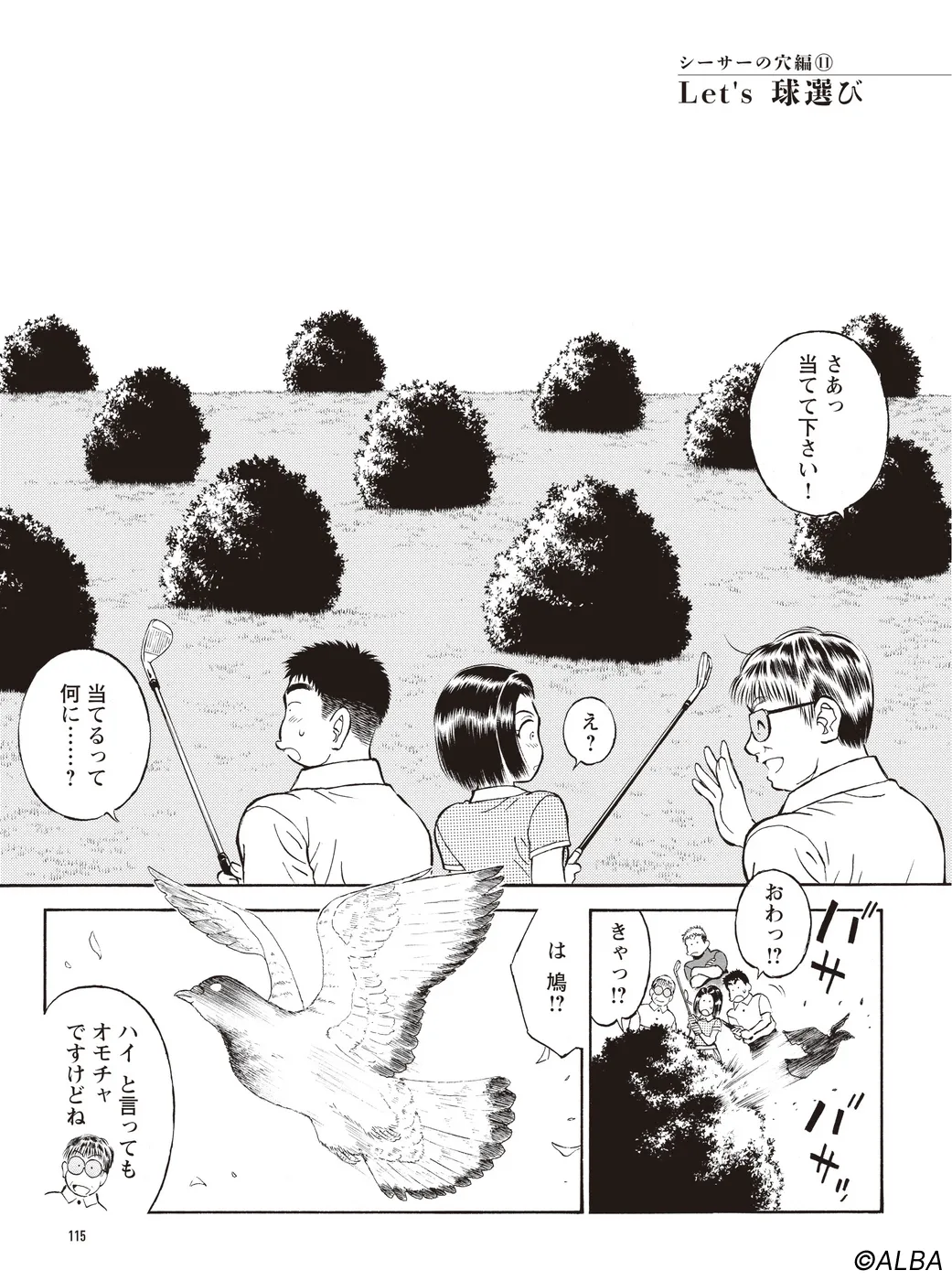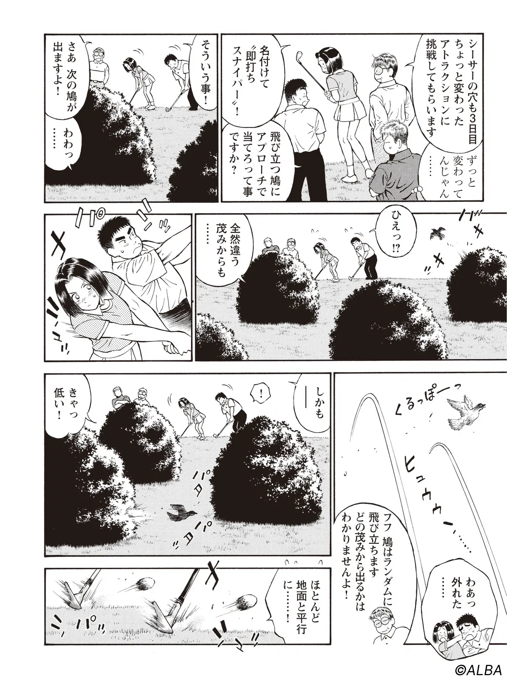 【シーサーの穴編|シリーズ概要】宮里道場を訪れた兄妹、飯玉南乃二(いいたま なのに)と飯玉卯津代(いいたま うつよ)。「スイングはいいのに…」と悩む兄に対し、“練習場シングル”から脱却させ、宮里流のゴルフ力を伝授するべく、ゴルフテーマパーク“シーサーの穴”へと導く。(指導:宮里優/脚本:かわさき健/作画:本島幸久)