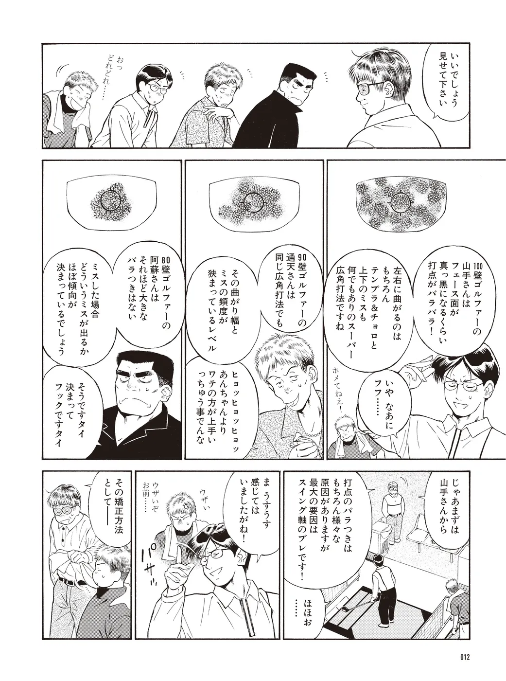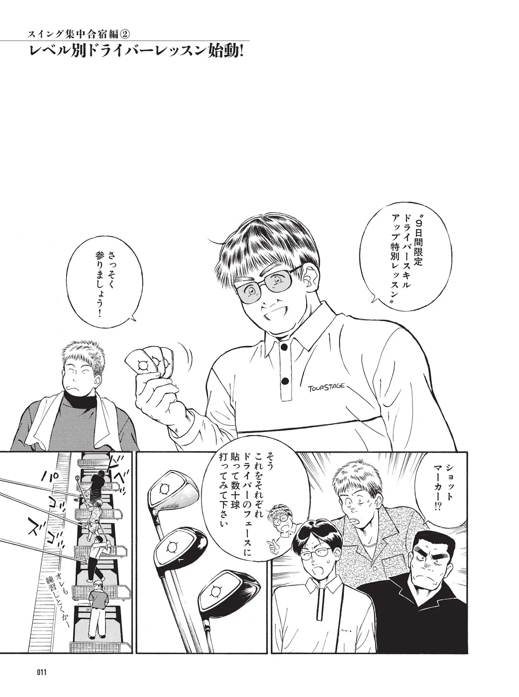 【スイング集中合宿編|シリーズ概要】宮里道場の生徒募集で集まってきた山手泉(いずみ)、通天覚(さとし)、阿蘇賛(さん)。100の壁、90の壁、80の壁…課題が異なる三人の悩めるゴルファーに対し、レベル別ドライバースキルアップレッスンが始まる…。(指導:宮里優/脚本:かわさき健/作画:本島幸久)