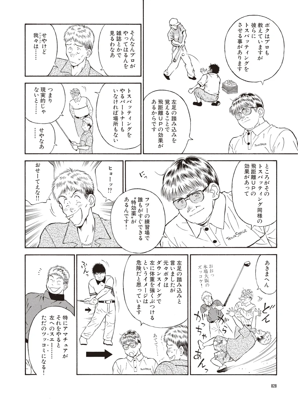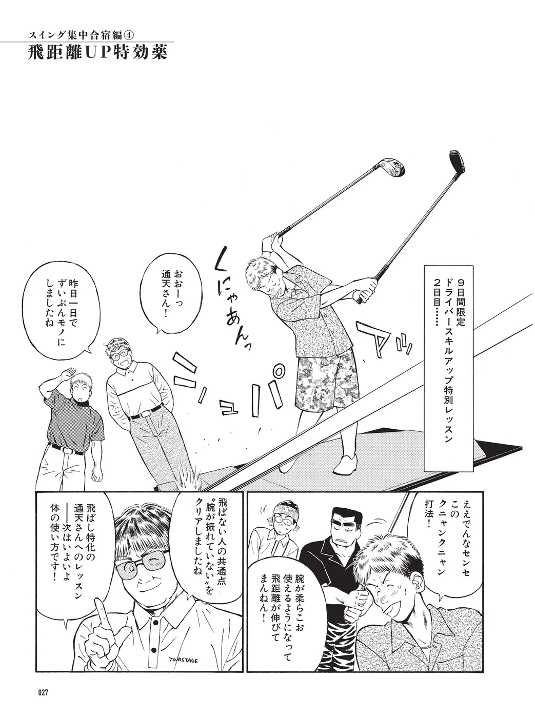 【スイング集中合宿編|シリーズ概要】宮里道場の生徒募集で集まってきた山手泉(いずみ)、通天覚(さとし)、阿蘇賛(さん)。100の壁、90の壁、80の壁…課題が異なる三人の悩めるゴルファーに対し、レベル別ドライバースキルアップレッスンが始まる…。(指導:宮里優/脚本:かわさき健/作画:本島幸久)