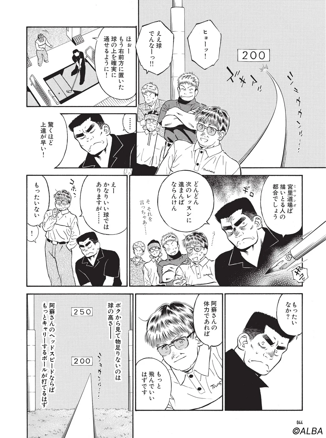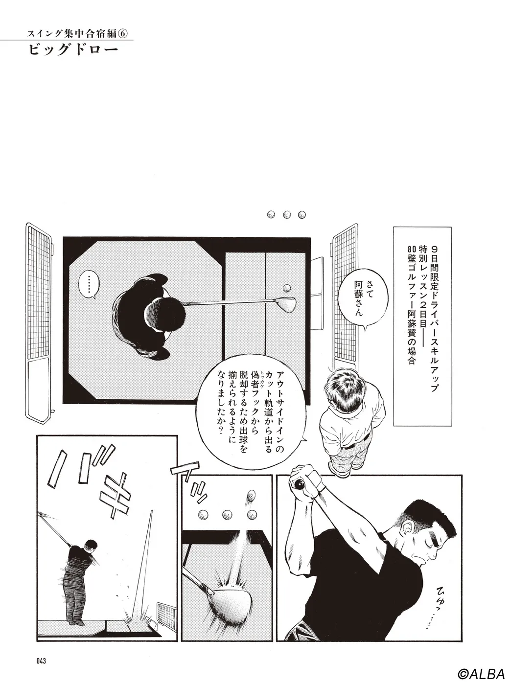 【スイング集中合宿編|シリーズ概要】宮里道場の生徒募集で集まってきた山手泉(いずみ)、通天覚(さとし)、阿蘇賛(さん)。100の壁、90の壁、80の壁…課題が異なる三人の悩めるゴルファーに対し、レベル別ドライバースキルアップレッスンが始まる…。(指導:宮里優/脚本:かわさき健/作画:本島幸久)