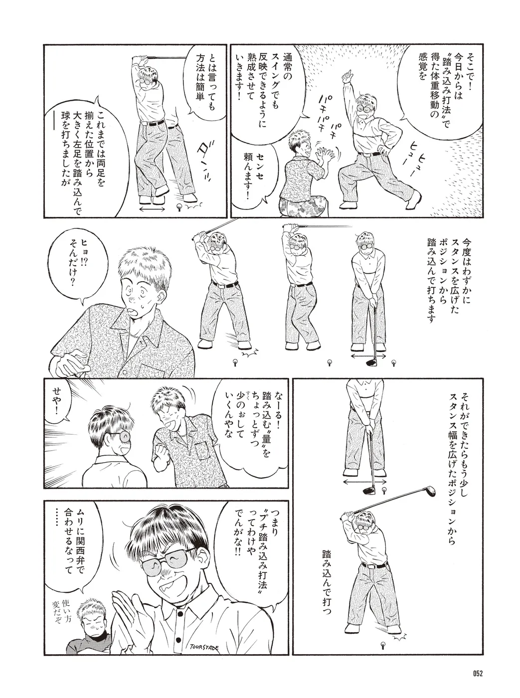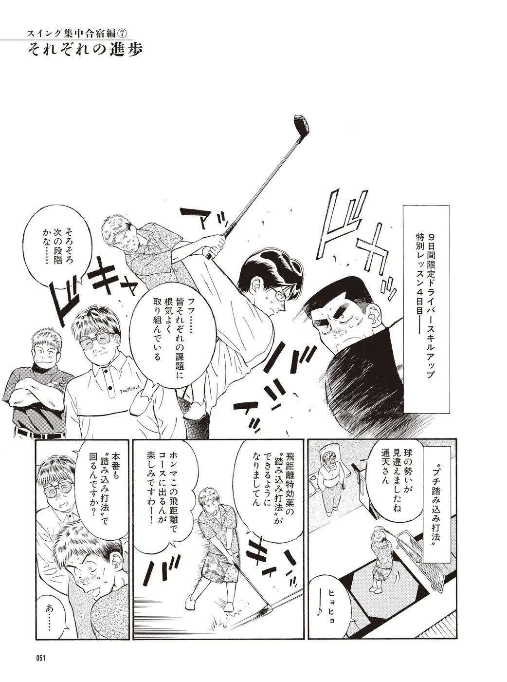 【スイング集中合宿編|シリーズ概要】宮里道場の生徒募集で集まってきた山手泉(いずみ)、通天覚(さとし)、阿蘇賛(さん)。100の壁、90の壁、80の壁…課題が異なる三人の悩めるゴルファーに対し、レベル別ドライバースキルアップレッスンが始まる…。(指導:宮里優/脚本:かわさき健/作画:本島幸久)