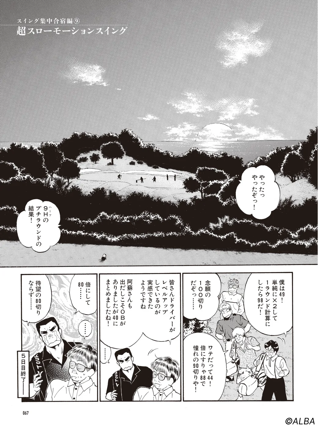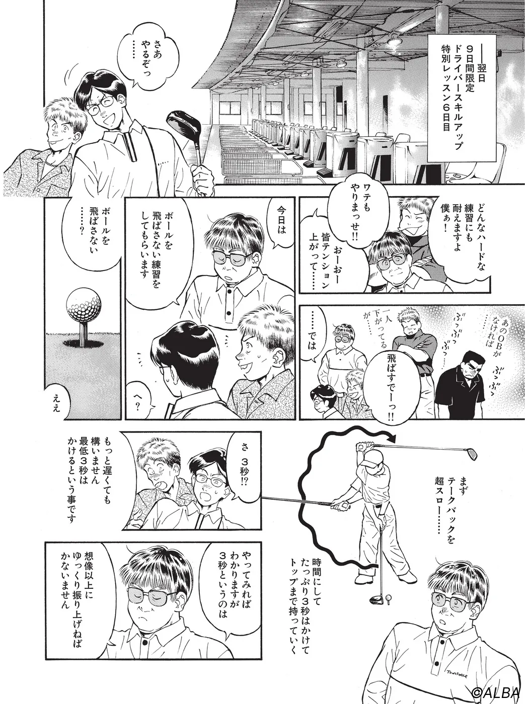 【スイング集中合宿編|シリーズ概要】宮里道場の生徒募集で集まってきた山手泉(いずみ)、通天覚(さとし)、阿蘇賛(さん)。100の壁、90の壁、80の壁…課題が異なる三人の悩めるゴルファーに対し、レベル別ドライバースキルアップレッスンが始まる…。(指導:宮里優/脚本:かわさき健/作画:本島幸久)