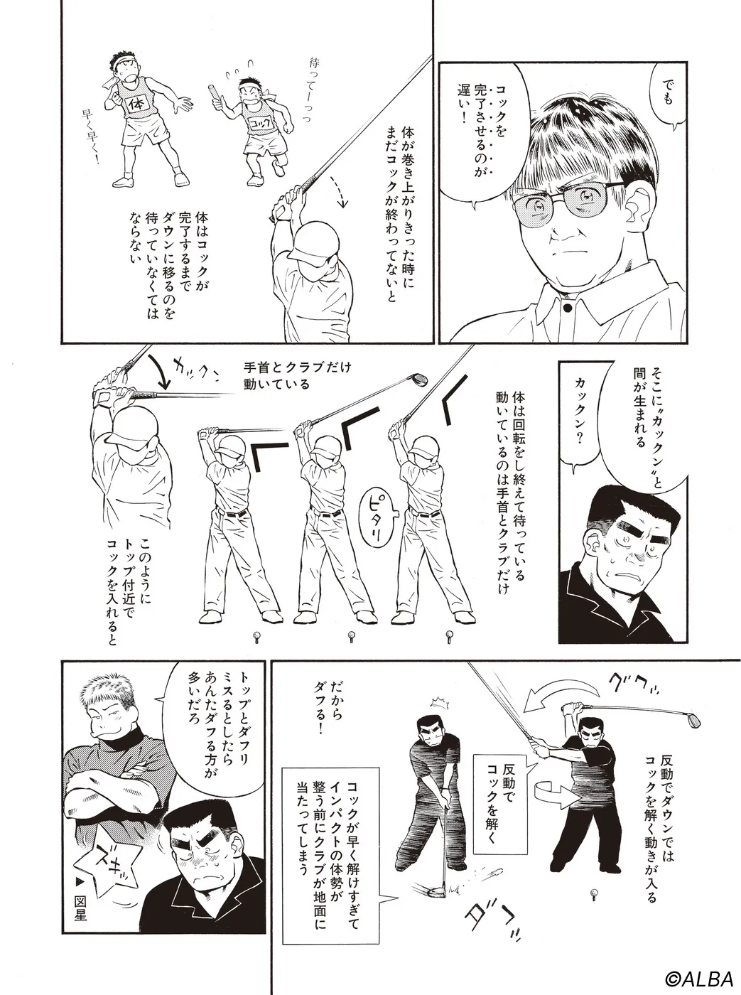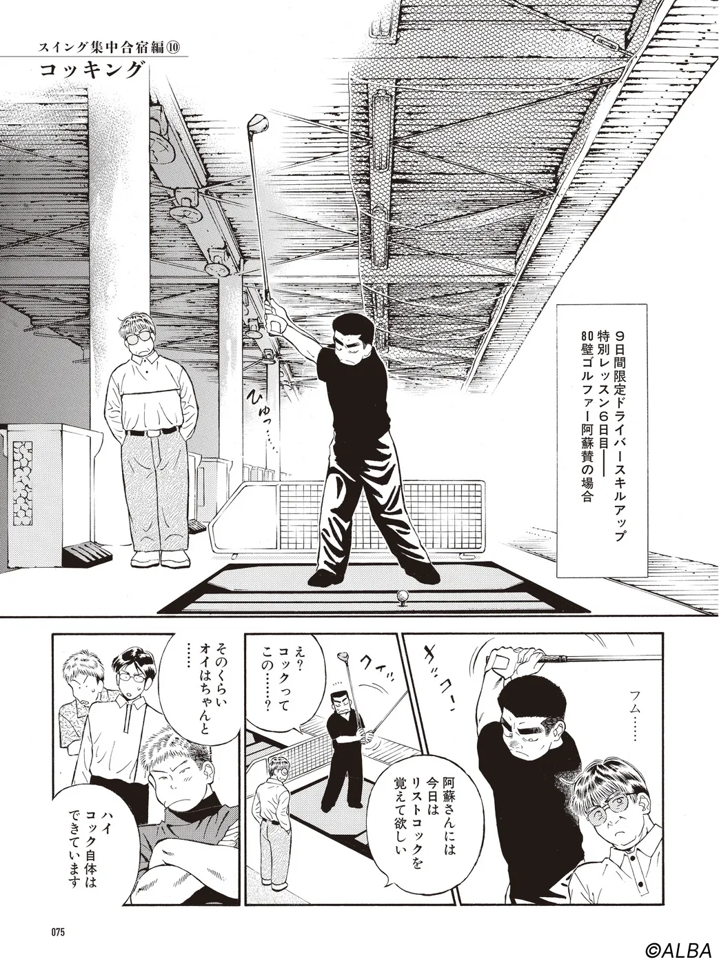 【スイング集中合宿編|シリーズ概要】宮里道場の生徒募集で集まってきた山手泉(いずみ)、通天覚(さとし)、阿蘇賛(さん)。100の壁、90の壁、80の壁…課題が異なる三人の悩めるゴルファーに対し、レベル別ドライバースキルアップレッスンが始まる…。(指導:宮里優/脚本:かわさき健/作画:本島幸久)