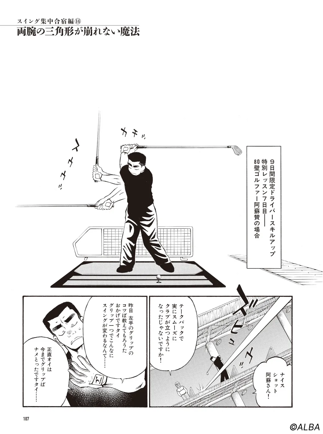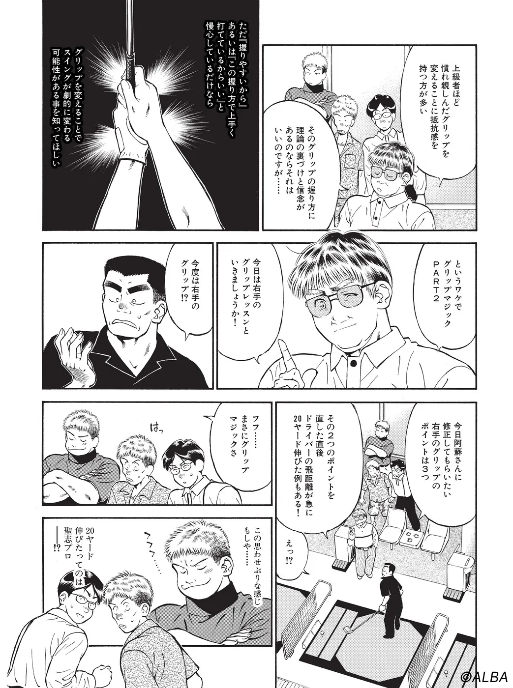 【スイング集中合宿編|シリーズ概要】宮里道場の生徒募集で集まってきた山手泉(いずみ)、通天覚(さとし)、阿蘇賛(さん)。100の壁、90の壁、80の壁…課題が異なる三人の悩めるゴルファーに対し、レベル別ドライバースキルアップレッスンが始まる…。(指導:宮里優/脚本:かわさき健/作画:本島幸久)